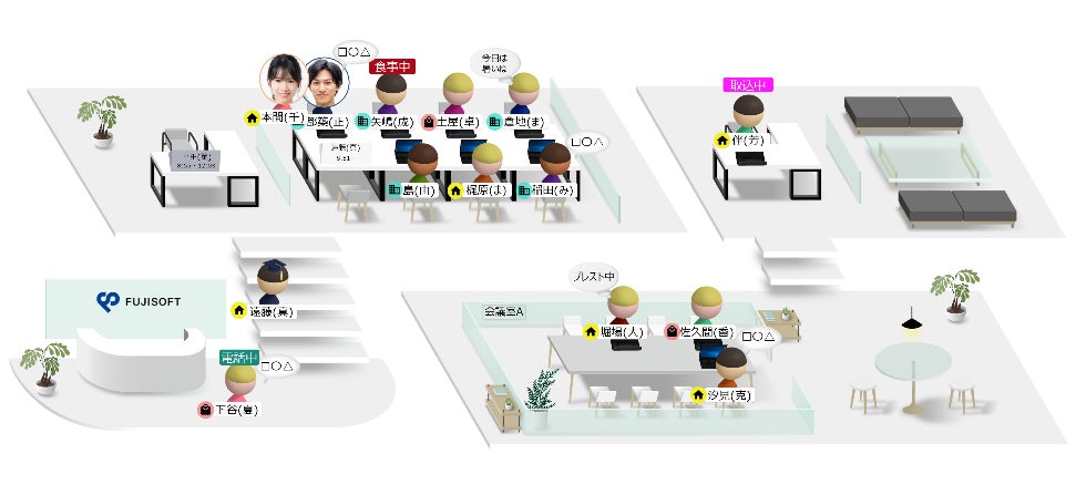 仮想オフィスFAMofficeは、離れていても同じ空間にいるようにコミュニケーションが取れ、場所にとらわれない多様な働き方を実現する仮想オフィスです。社員の業務状況を俯瞰することができ、自身のアバターを相手のアバターに重ねるだけの簡単操作で気軽にビデオ通話を開始できます。