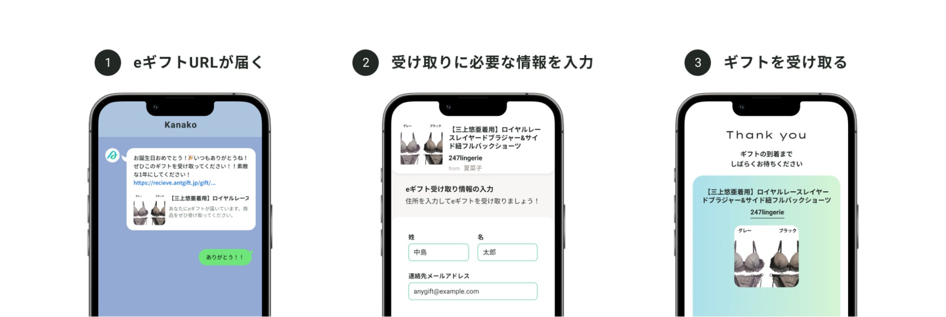今回、AnyGiftの提供により、「247lingerie 公式オンラインストア」にて全ての商品がeギフトとして贈れるようになりました。プレゼントとして難易度が高いといわれていた下着ですが、サイズや届け先は受け取り側が指定できるため、気軽にギフトを贈ることができます。