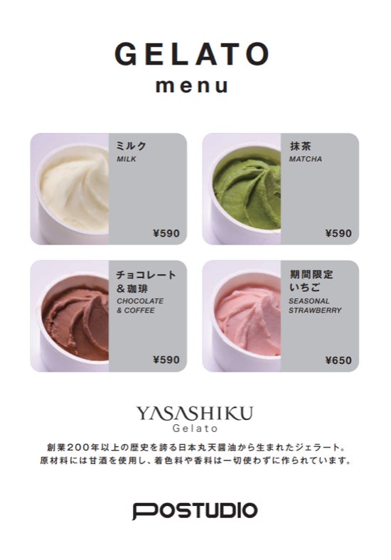 創業200年以上の歴史を誇る老舗醤油会社。9月上旬に新しくオープンしたNEWoMan高輪内の「POSTUDIO(ポスタジオ)」にてYASASHIKU Gelatoの販売を開始