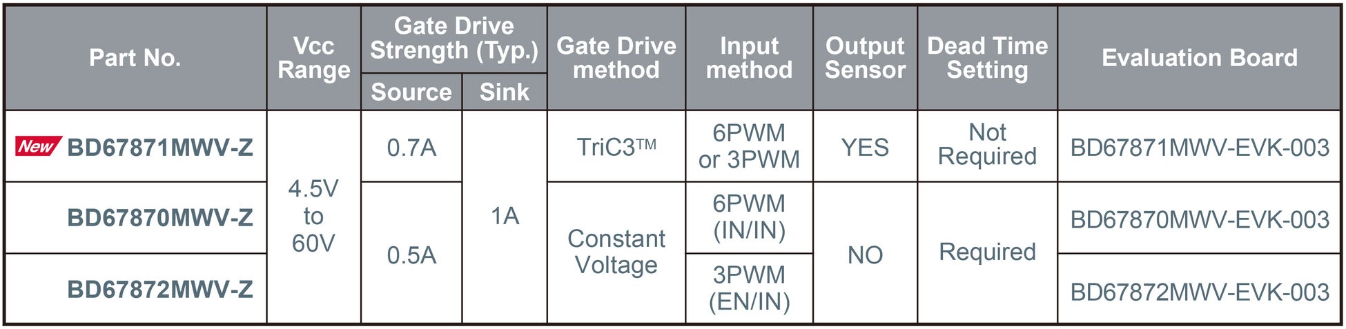 また、新製品と同パッケージかつ同ピン配置で定電圧駆動の汎用モータドライバ(BD67870MWV-Z、BD67872MWV-Z)もラインアップしています。汎用タイプから、今回のTriC3™を搭載した付加価値タイプまで、幅広い顧客ニーズに応える製品を取り揃え、モータの効率向上、アプリケーションの高機能化、そして消費電力の削減に貢献してまいります。