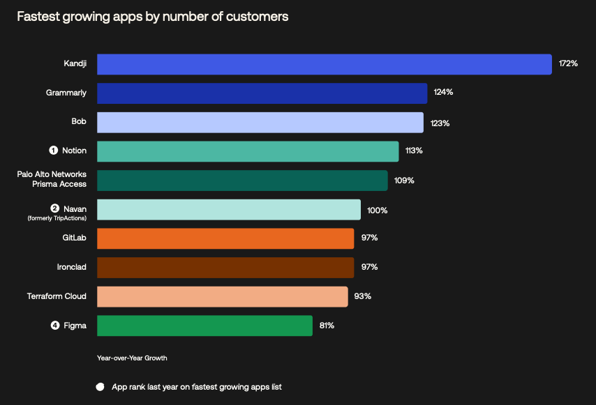 最も急成長したアプリとなったのは、Kandjiで、顧客数の成長率が前年比172%増となりました。KanjiはAppleのモバイルデバイス管理アプリで、IT管理者が繰り返し行う作業を自動化します。Kandjiの急成長は、ITチームがより少ない労力でより多くのことを行おうとする中で、自動化が強く求められていることを示唆しています。