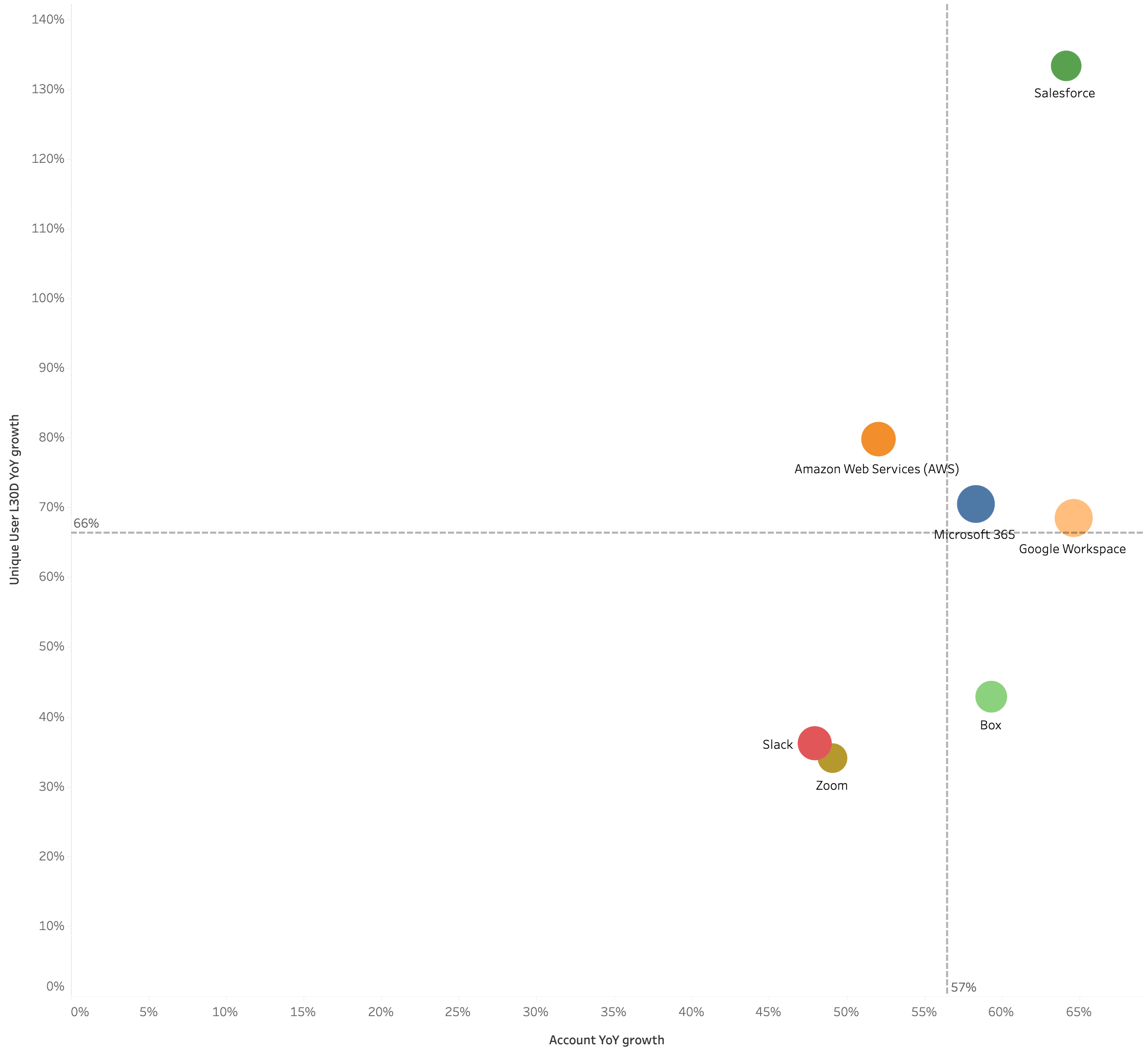 顧客数の規模では、Google Workspaceがトップで、その後をMicrosoft 365、AWS、Slack、Box、Salesforce、Zoomが続きました。