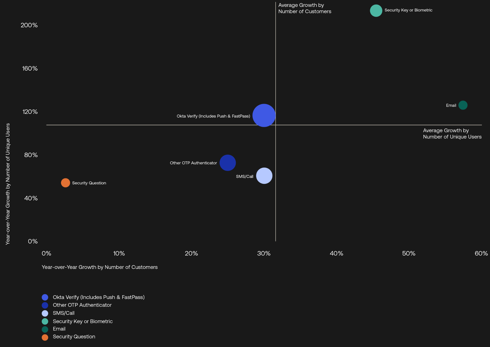安全性の高い所有ベースの要素であるOkta Verifyは、現在88%のお客様に導入されており、2年前と比較して6ポイント増加しています。
