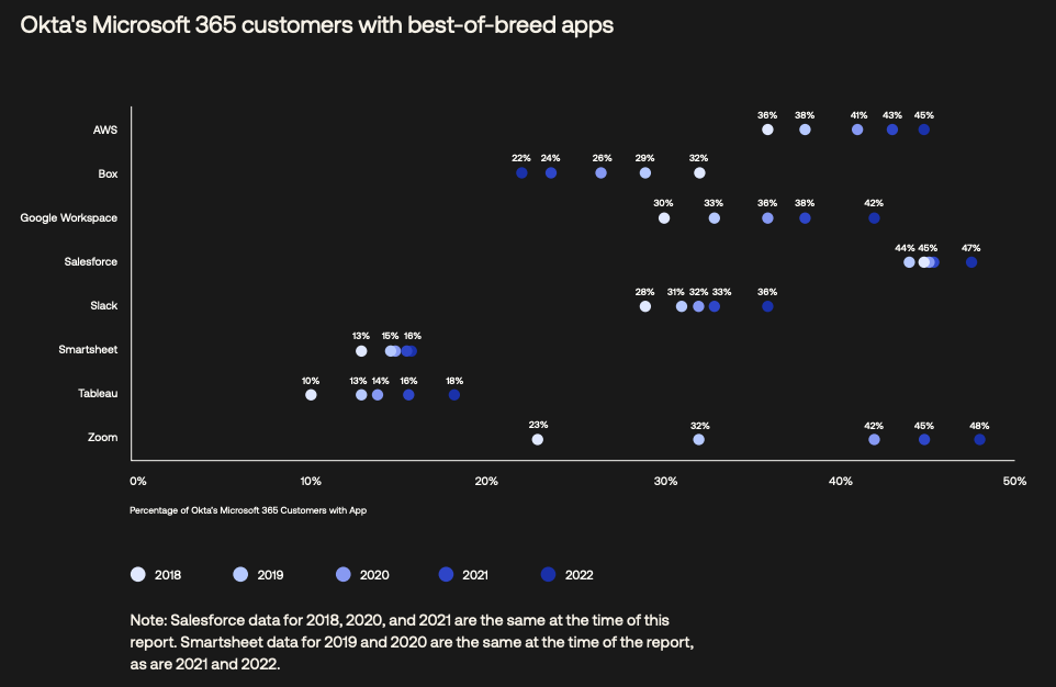 毎年、OktaのMicrosoft 365のお客様が、Microsoft 365スイートとは別にどのようなベストオブブリードアプリ(例えば、Zoom、Slackなど)を採用しているのか調査しています。今回は、OktaのMicrosoftのお客様の36%が4つ以上のベストオブブリードアプリを使用していることが分かりました(5年前の20%から上昇)。