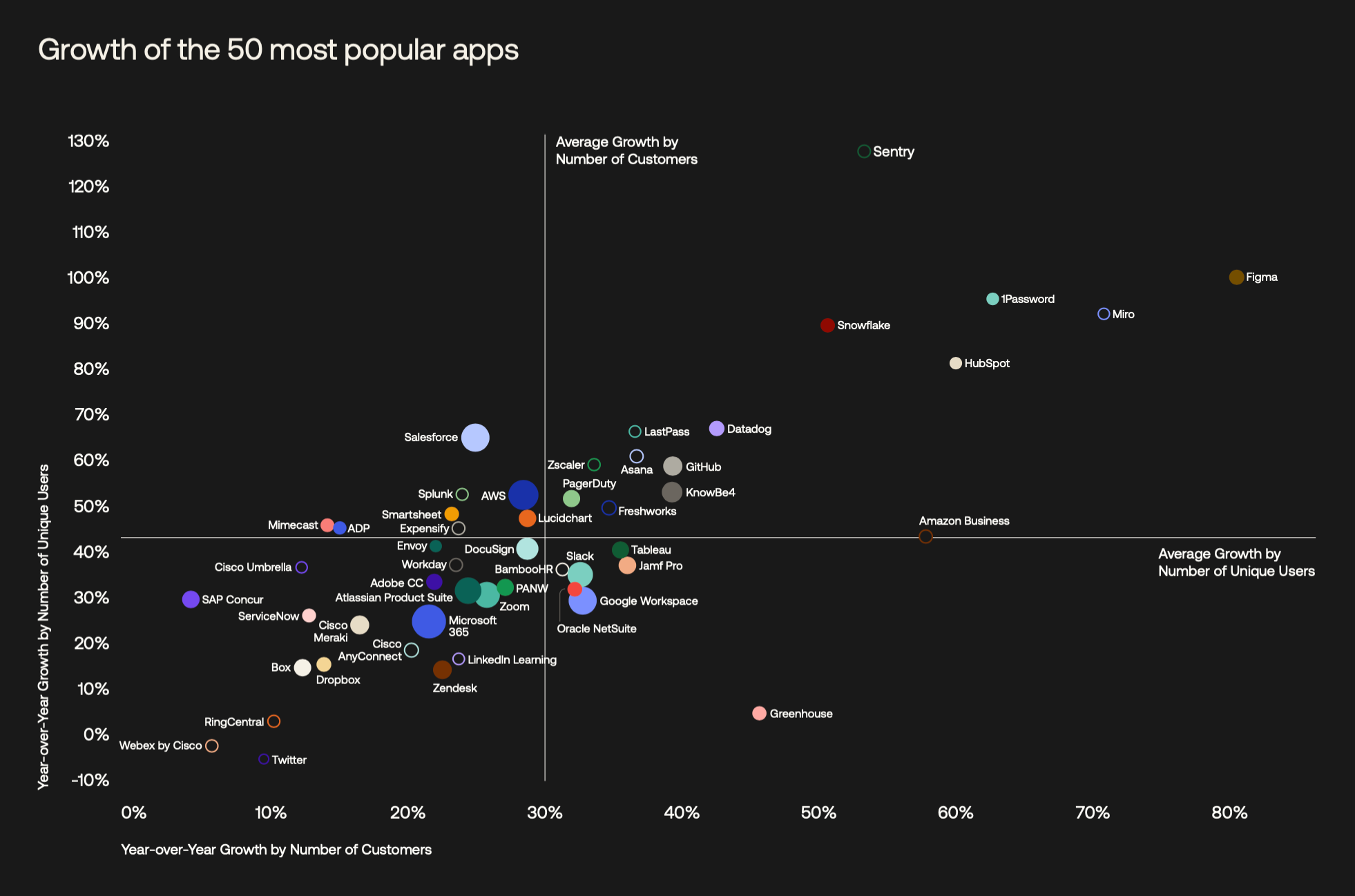 顧客数の規模によるランキングに注目すると、顧客数でトップのアプリは依然としてMicrosoft 365で、その後をAWS、Google Workspace、Salesforce、Zoom、Atlassian Product Suite、Slack、DocuSign、KnowBe4が続きました。1位から9位までのランキングは昨年と変わりませんが、GitHubが昨年より2つポジションを上げて、10位になりました。また、Jamf Proが今回初めて15位にランクインしました。