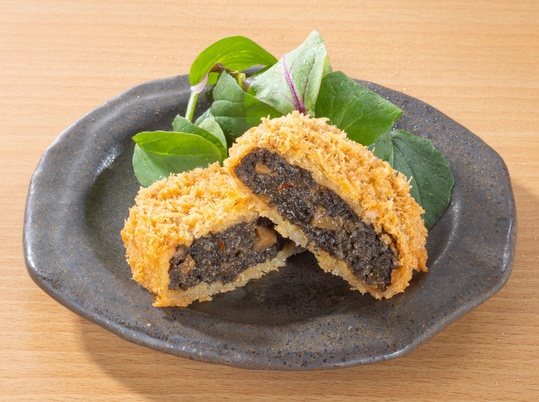 デリカ店舗で限定販売されるのは、インパクトのある見た目が特徴的な“黒い”メンチかつ。さぼてん初登場となる「黒ごま坦々メンチかつ」は、黒ごまのなめらかなコクと花椒のピリっとしびれる爽やかな香り、レンコンとたけのこの食感を楽しめるほか、相性の良いすりごまと練りごまをたっぷりと使用した新感覚の逸品です。温めて、何もつけずにそのままお召し上がりいただくと、素材の味と香りが一層引き立ちます。