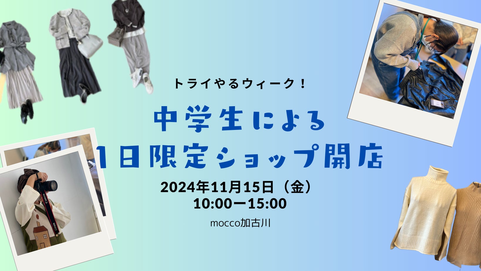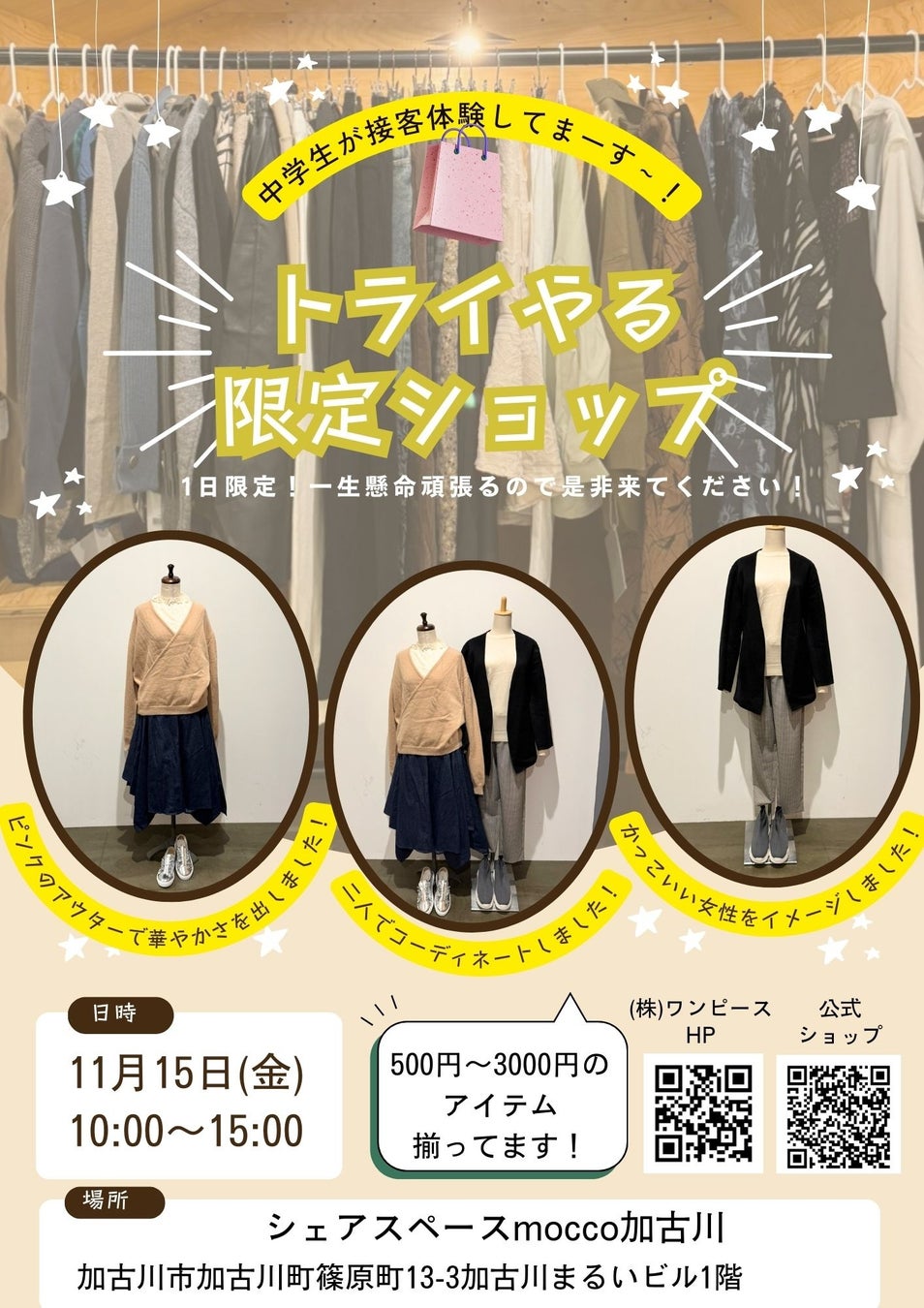 レディースアパレル通販を運営する株式会社ワンピース(本社:兵庫県加古川市、代表取締役:春木晃子。以下ワンピース)は、シェアスペースmocco加古川にて2024年11月15日(金)10:00から15:00、トライやるウィークとして職業体験中の別府中学生による1日限定アパレルショップを開催することをお知らせします。