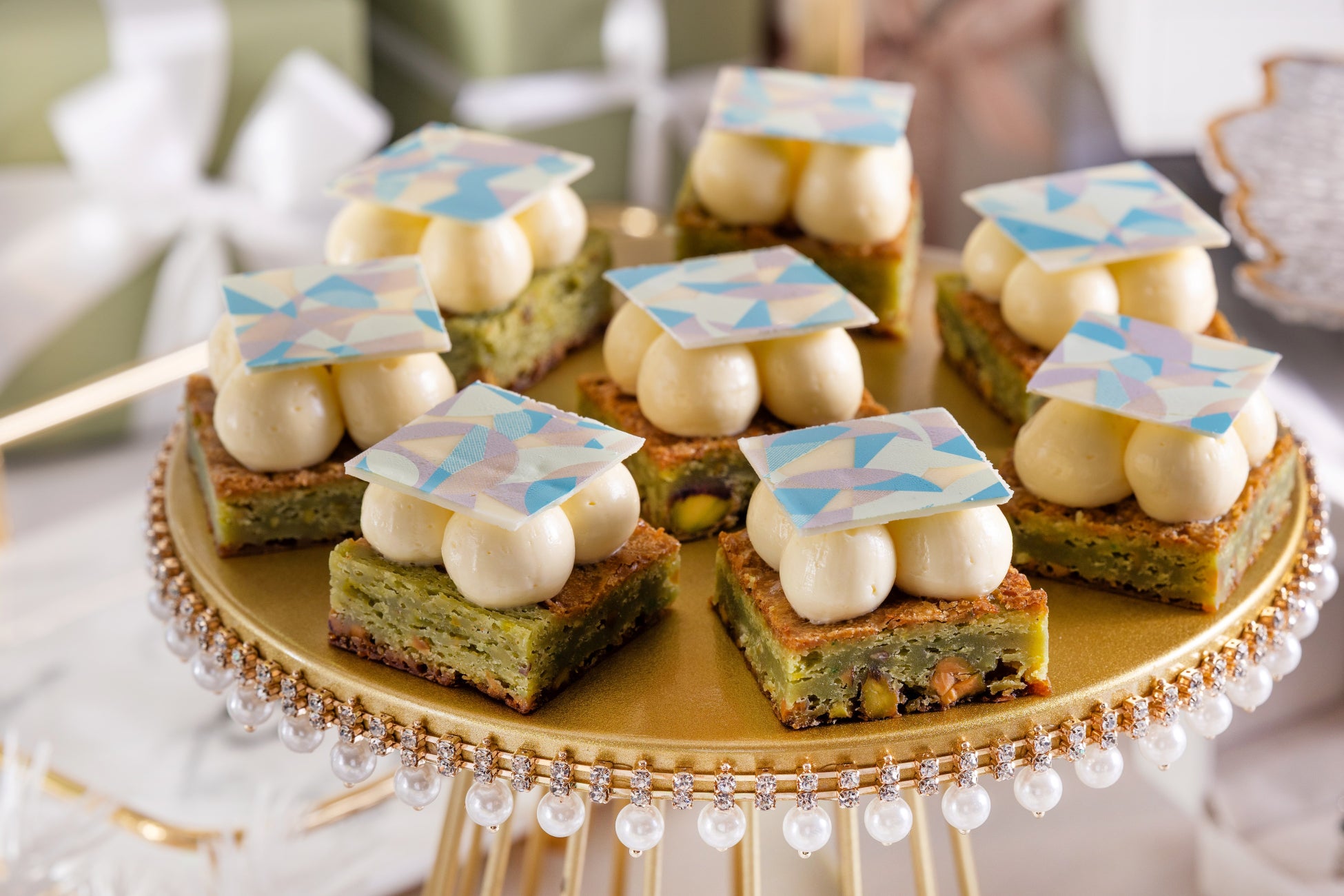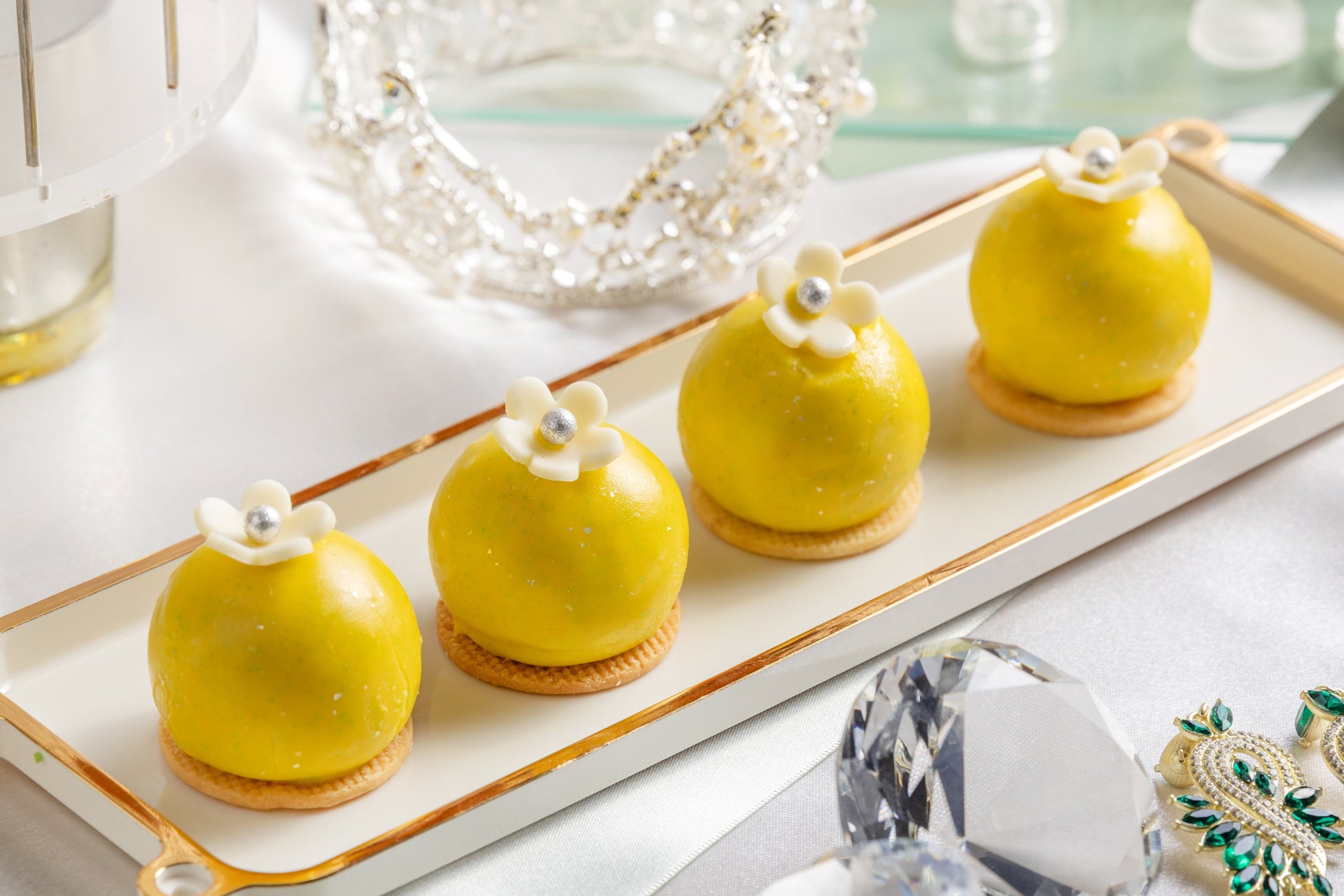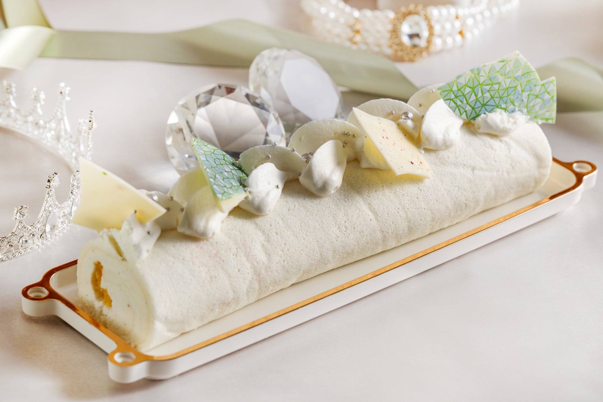 歴史上の様々な王妃やロイヤルファミリーに愛された5月の誕生石「エメラルド」。5月3日(土・祝)から開催のスイーツビュッフェでは、「エメラルド」を中心とした華やかなジュエリーをテーマとした約20種類の煌めくスイーツとセイボリー(軽食)をご用意致しました。王妃が愛でたであろう宝石箱をイメージした世界観の中に、ミント、グリーンアップル、メロン、抹茶などを使用した爽やかなスイーツが並びます。「エメラルドの鉱物タルト」は、かつてクレオパトラがエジプトに自分だけのエメラルド鉱山を所有していたという逸話から着想を得た一品で、レモン風味の琥珀糖と大胆に絞ったレモンクリームが荒野の中に輝くエメラルドの鉱脈を表現します。ステンドグラスを連想させる柄のチョコレートを飾った「ピスタチオ グラスマレライ」は、パッションフルーツを使用した甘酸っぱくトロピカルなバタークリームとピスタチオの甘い芳香を放つケーキのコンビネーションがご賞味頂けます。香水の瓶をモチーフにした「アロマ香るバブルアトマイザー」は、パイナップルジャムをココナッツムースで包み、仕上げにチョコレートでコーティングをしました。また澄んだ鮮緑色をした鉱物ベリルに着想を得た「ミントグリーンベリル」、原石が房の様な見た目をしている宝石プレナイトをモチーフにした「プレナイトの輝き」、グリーンアップルジャムを包んだヴァニラ風味のケーキポップ「王妃のケーキポップ」など魅惑のスイーツをご堪能ください。