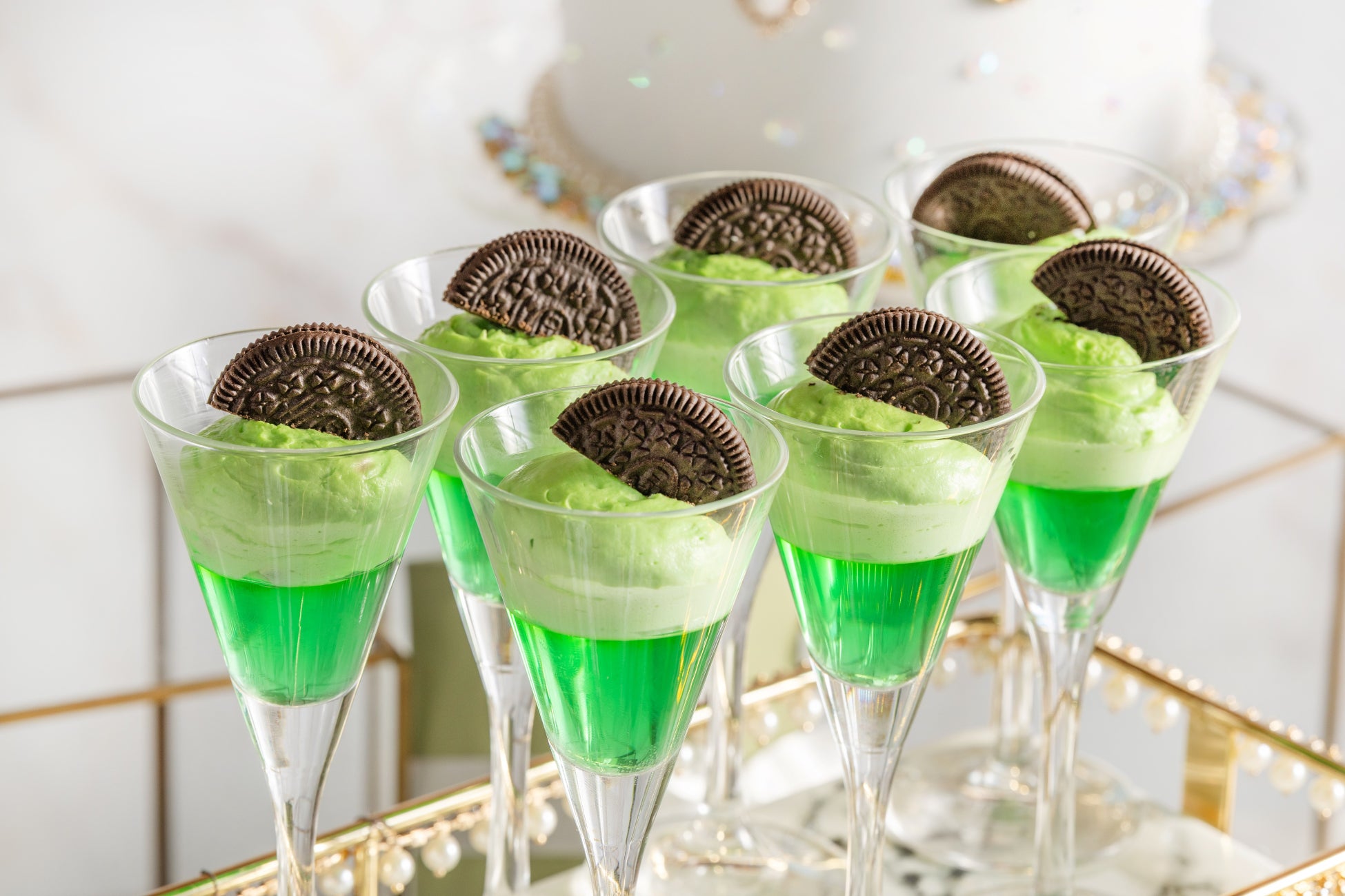 爽やかなミントをゼリーの上に、少し甘味の強いミントのチョコチップが入ったクリームをふんわりと絞りました。澄んだエメラルド色が特徴的な一品です。