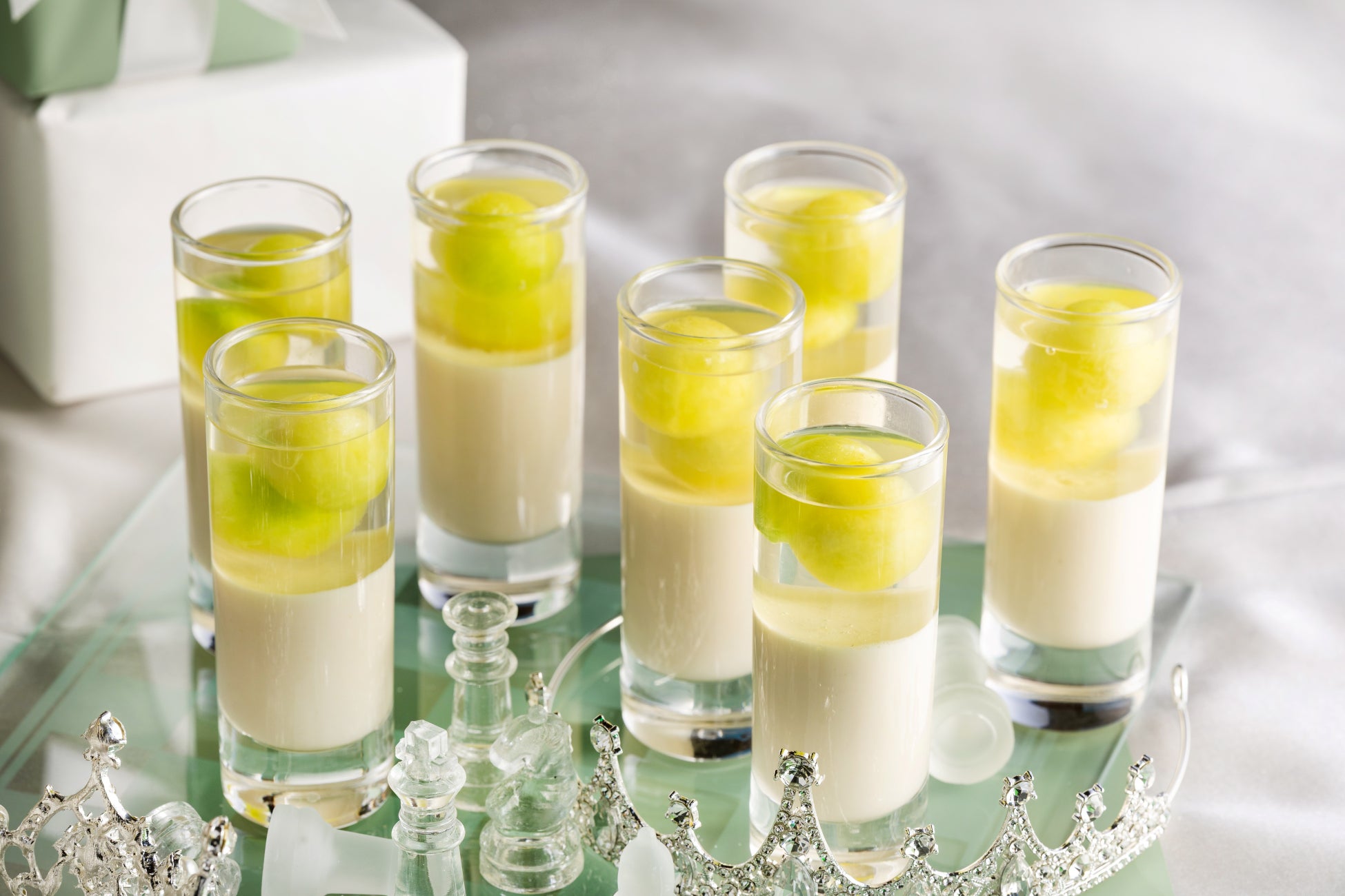 生姜のアクセントが効いたパンナコッタと贅沢にスクープしたメロンが入ったメロンゼリーの層が楽しめます。宝石プレナイトに着想を得ました。