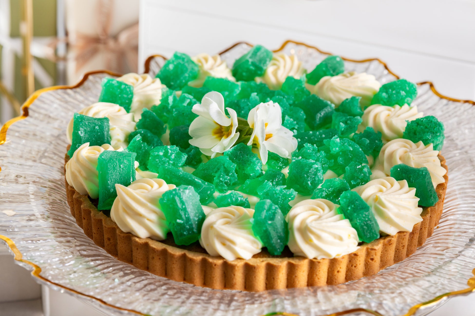 アーモンドとバター香るタルト生地に、レモン風味の琥珀糖と大胆に絞ったレモンクリームが爽やかな風味を加える初夏にピッタリの一品。