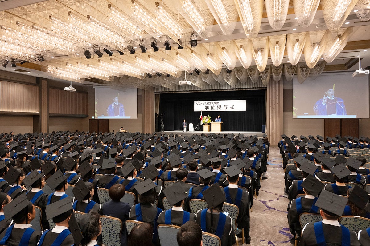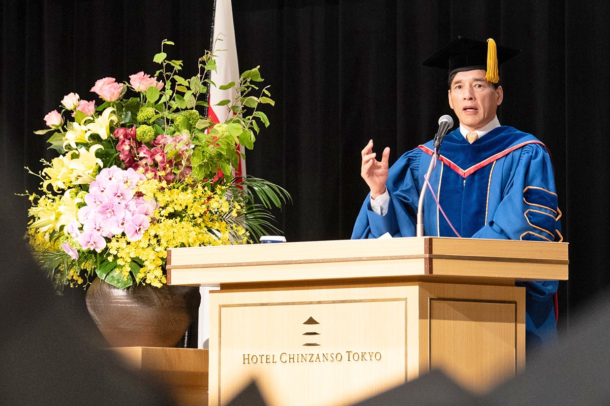 学位授与式(卒業式)で学長の堀義人は、「皆さんには、自らの果たすべき使命に向かい、その使命感から生まれる情熱のもと、世界観と歴史観、人生観と倫理観に従った『人間の軸』を持って邁進し、“創造と変革の志士”として大成してほしい。大いにリスクをとって挑戦し、試練を楽しみながら、成長していただきたい」と式辞を述べました。