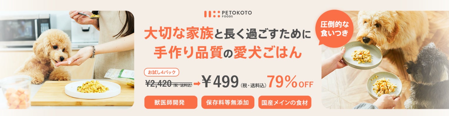 また、「ペトコトフーズ」は、お試し4パックを79%OFFの499円で購入いただけるので、気軽に、そしておトクにお試しいただけます。この機会に、ぜひ「ペトコトフーズ」をご利用ください。