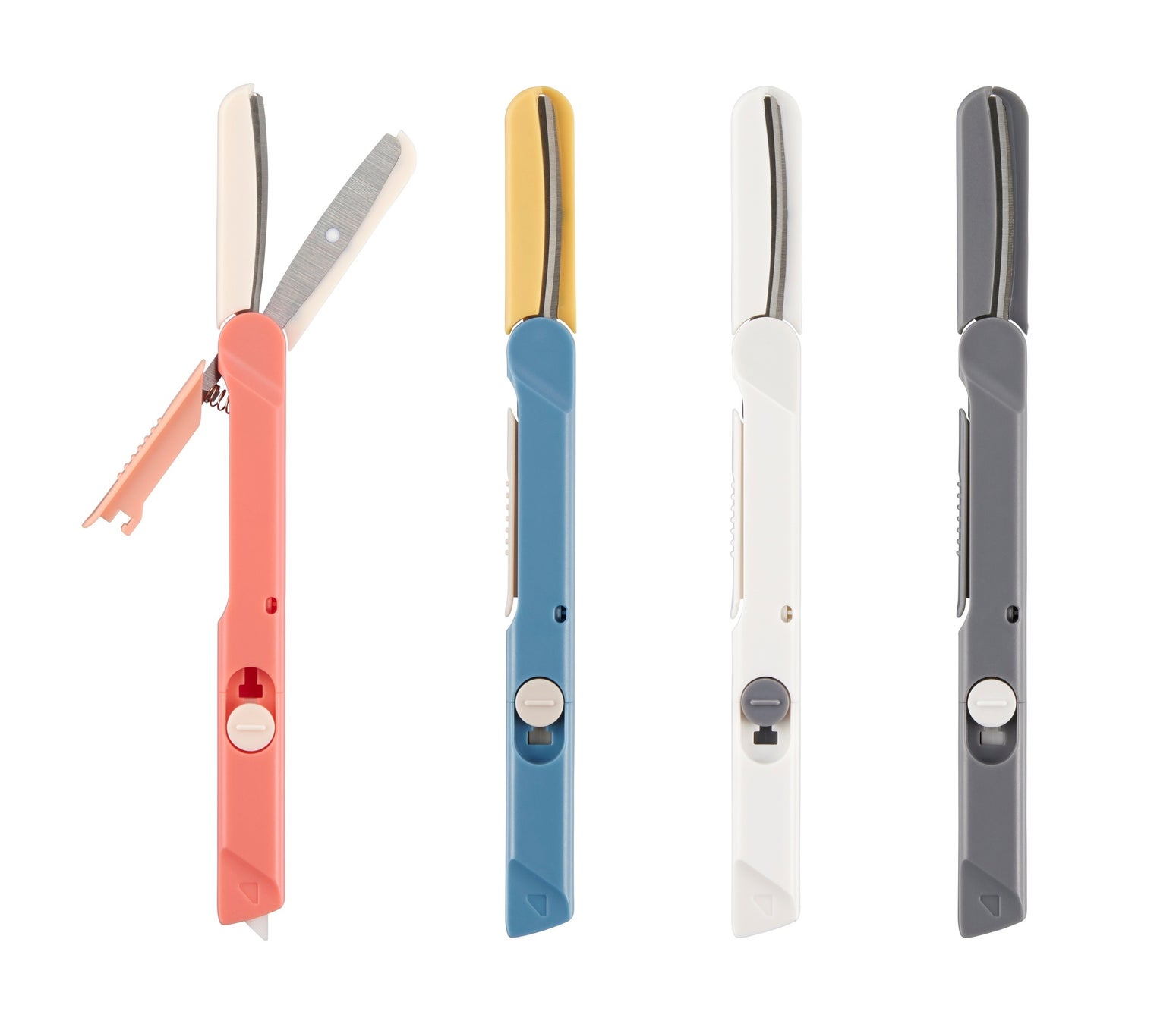 家庭用はさみのNo.1(※1)ブランド「フィットカットカーブ」シリーズの携帯はさみ「ツイッギー」に、セラミック製の開梱カッターをプラス。はさみとカッターそれぞれの特性を生かして開梱・開封のあらゆるシーンに1本で対応し、梱包テープや封筒、袋、タグ、PPバンド、フィルムなどさまざまな素材をスムーズに切ることができます。はさみ部分は、ベルヌーイカーブ刃(※2)によるサクサクとした快適な切れ味はそのままに、キャップレス仕様でさっと使える手軽さと安全性を両立。開梱カッターは、段ボールの厚さに合わせた長さで、荷物の中身を傷つけにくい設計です。ネオジム磁石内蔵で、玄関ドアなどに付けて保管ができます。