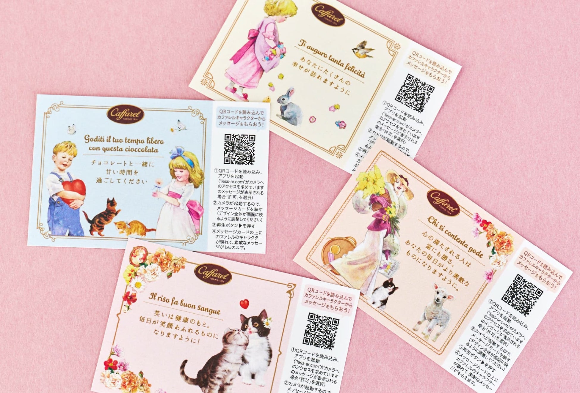 バレンタインコレクションの缶商品にセットされているメッセージカードは全4種類。それぞれにポジティブな気持ちになれるメッセージが書かれています。さらに、メッセージカードに記されたQRコードをスマートフォンで読み取ると、カファレルのキャラクターからメッセージが受け取れる仕掛け付きとなっています。※メッセージカードはあらかじめパッケージ内にセットされており、デザインやメッセージ内容は選べません
