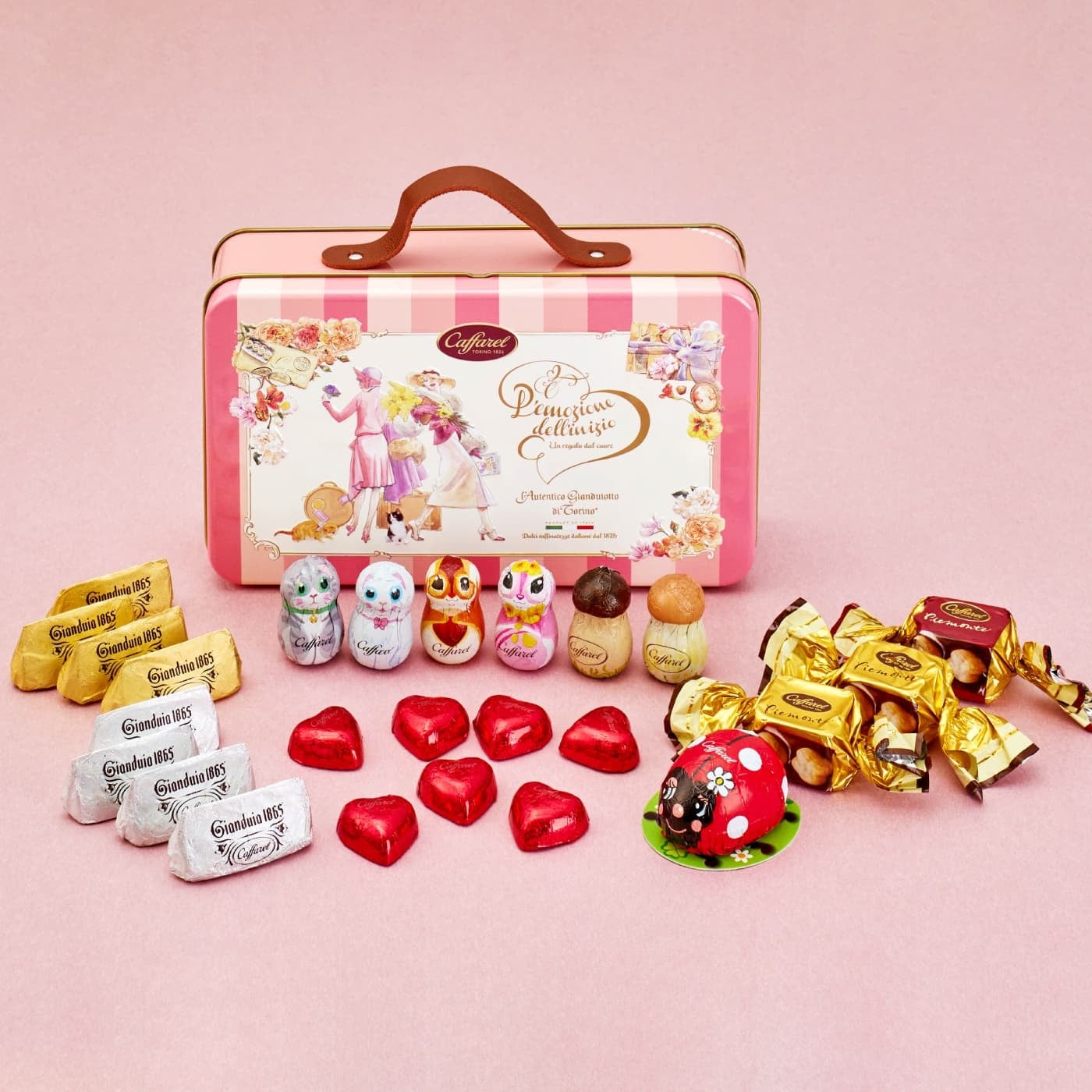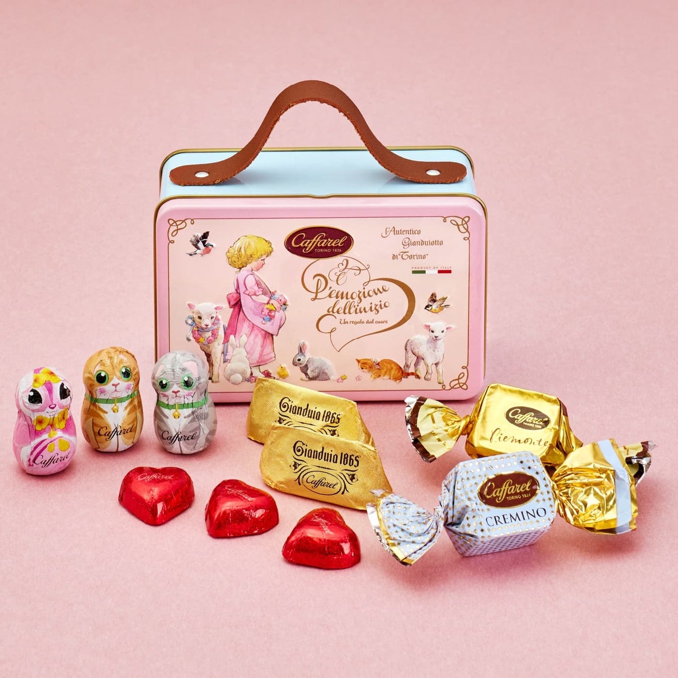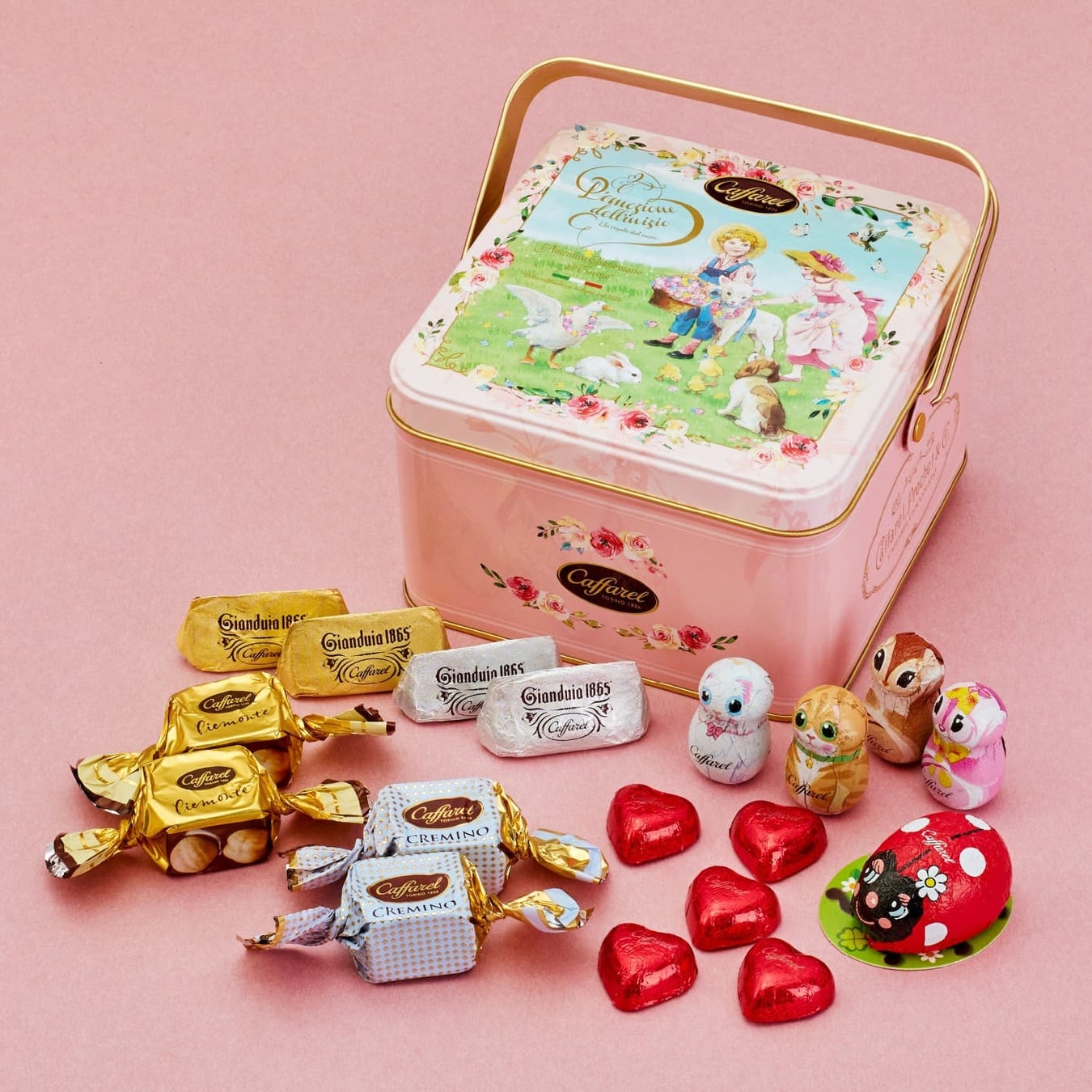 内容:動物たちと一緒にプレゼント用のお花を摘んでいる女の子が描かれたトランク缶。カファレルでは初となる革のベルトが付いたデザインです。春らしいピンクとブルーを基調としたデザインもプレゼントにぴったりです。カファレルの定番であるジャンドゥーヤをはじめ、可愛らしいネコやリスのホイルチョコレートなど合計10粒をアソート。※メッセージカード入り