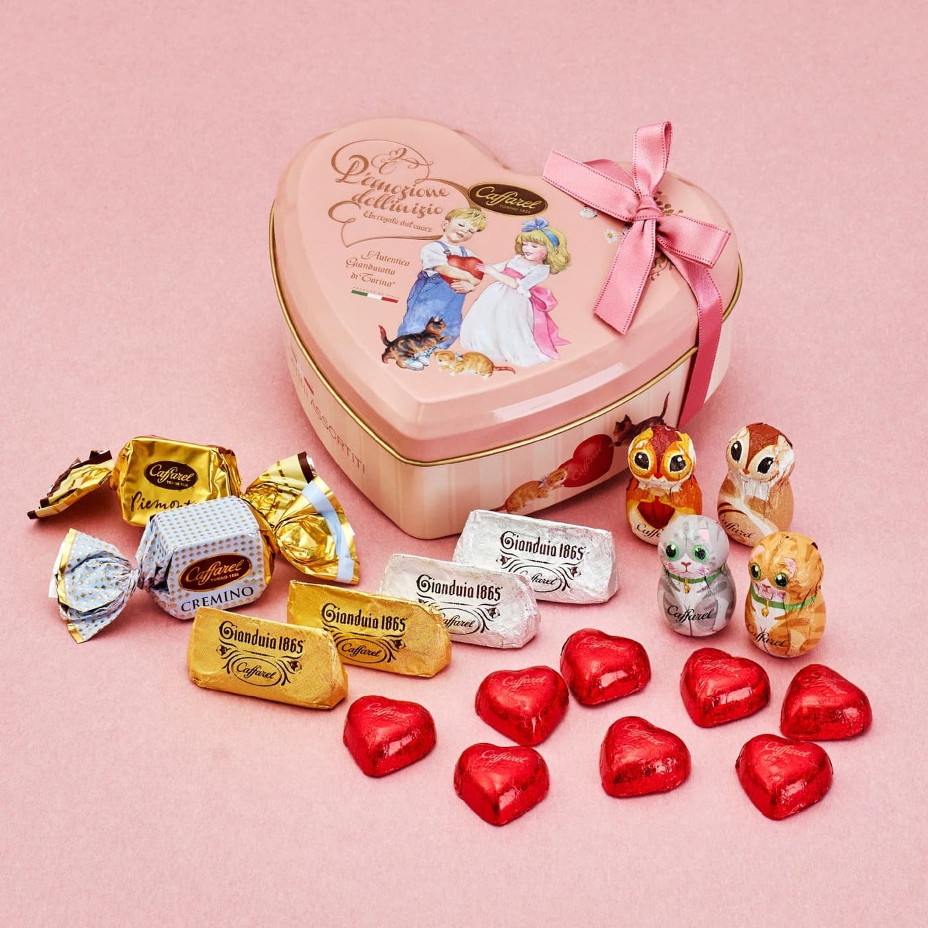 内容:バレンタインらしいハート型の缶にカファレルの代名詞であるジャンドゥーヤをはじめ、キラキラのホログラムが美しいハートのホイルチョコレートや、かわいらしい表情のネコやリスのホイルチョコレートなど種類豊富に合計18粒アソートしました。ピンクのリボン付きなので、そのままプレゼントにもおすすめです。※メッセージカード入り