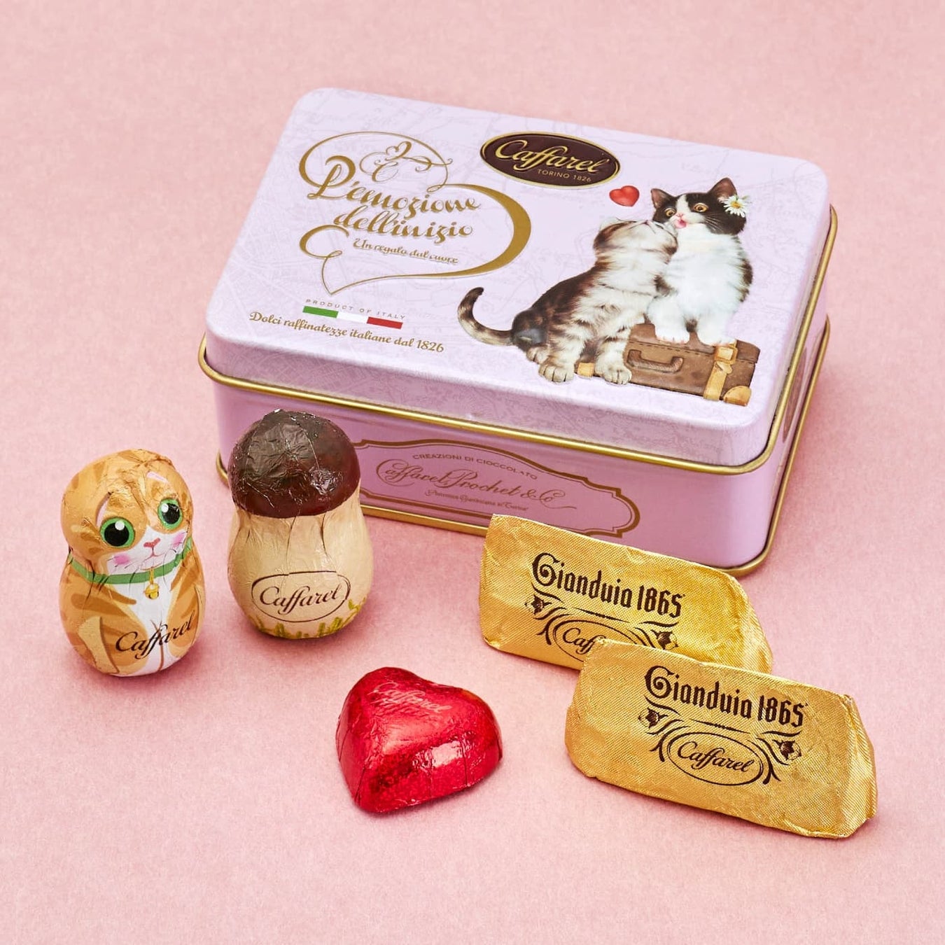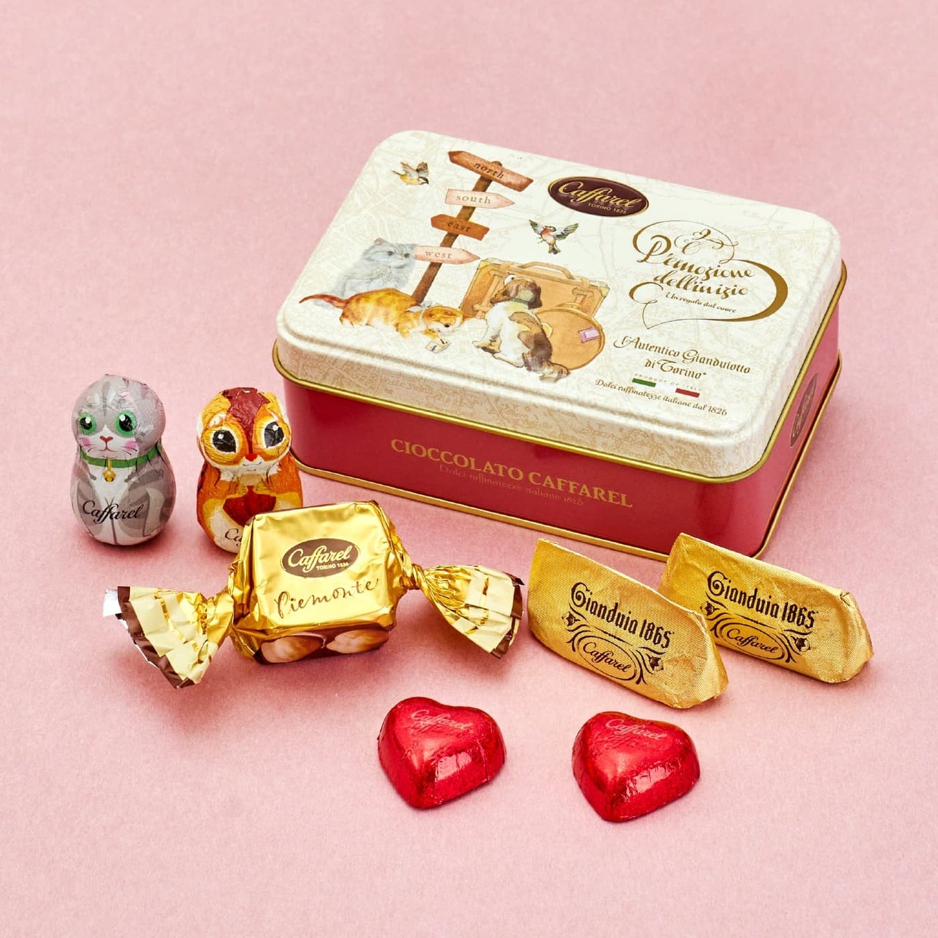 ジャンドゥーヤをはじめ、人気のネコやリス、きのこのホイルチョコレートや大粒のヘーゼルナッツが入ったピエモンテなど合計25粒のチョコレートをアソート。カファレルでは初となる革のベルトが付いており、高級感のあるデザインに仕上がっています。※メッセージカード入り
