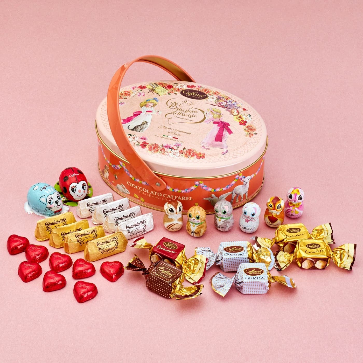 内容:取っ手付きのオーバル型のバスケット缶に、色とりどりの花をはじめ、アンティーク調のレターセットや万年筆、大切な人へのメッセージをしたためた手紙を持つ女の子が描かれた、大変ロマンチックなデザインです。中には定番のジャンドゥーヤやてんとう虫、ネコのホイルチョコレート、食べごたえ満点のピエモンテやクレミノなど合計30粒のチョコレートを贅沢にアソートしました。※メッセージカード入り