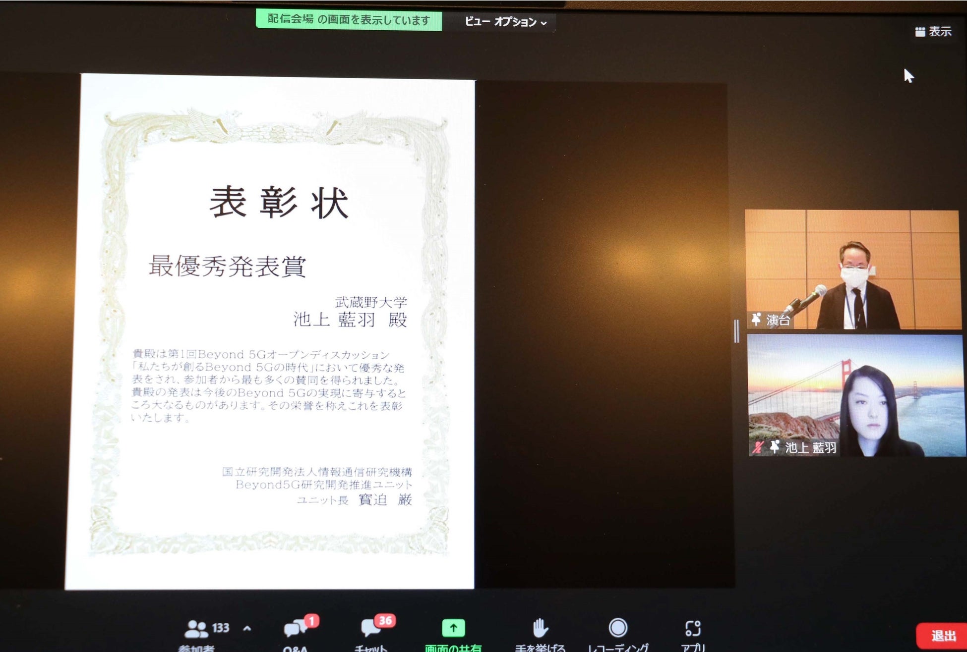武蔵野大学(東京都江東区)データサイエンス学部(以下、MUDS)2年生の池上 藍羽さんが国立研究開発法人 情報通信研究機構(以下、NICT)Beyond 5G 研究開発推進ユニット主催の「第1回Beyond 5G オープンディスカッション」に参加し、最優秀発表賞を受賞しました。