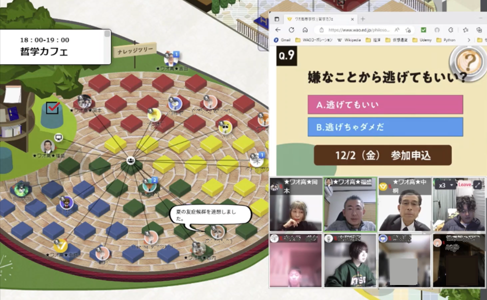 ワオ高校では、一人一人が哲学による気づきを通じて、自分の頭で「考え」、自信を持って「発言」できる力を磨けるような学びの場を増やしています。その一つである「哲学カフェ」は、「フランクな場で、もっと気軽に哲学を議論したい」という創始者の思いを継ぎ、オープンな場として、オンライン公開(毎週金曜日)しています。