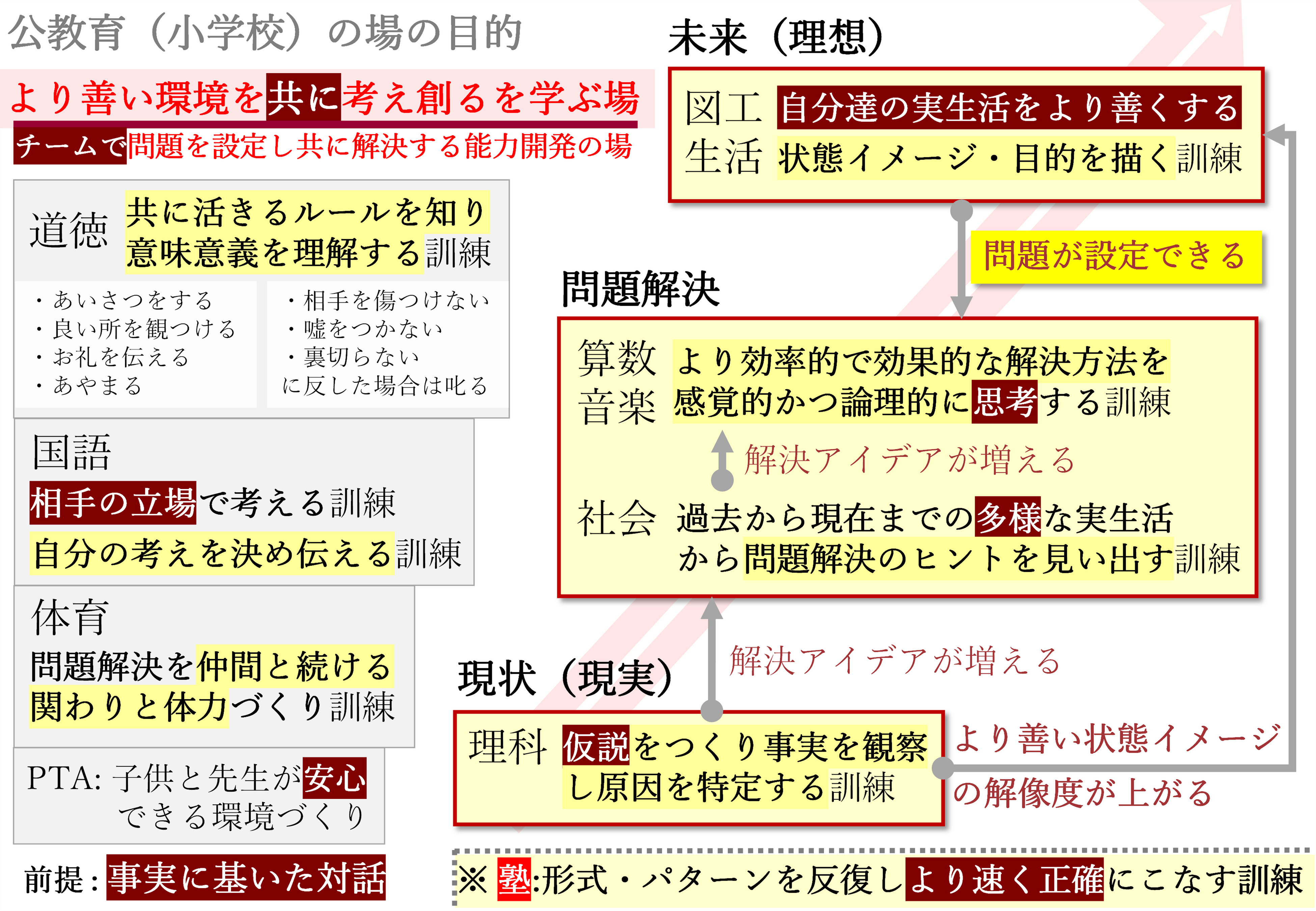 いずれも、昨今、企業で必要とされるようになった”人的資本経営”の文脈で”社会人・大人に求められている人材像”「自分で考え行動できる」、組織開発・チームビルディングの基礎にあたる「心理的安全」に直結。公立小学校の社会全体の中での目的を【より善い環境”自分達の実生活”を、共に考え創るを学ぶ場】【チームで未知の問題を設定し共に解決する能力開発の場】とすることで、各科目の目的も絞り込むことができる。各科目の目的が絞り込めることで、先生方のムダな負荷を削減できる。先生方が現場で抱える問題解決にもつながる。先生方が本来、時間を投入したい生徒の能力開発に時間を使うことができる。