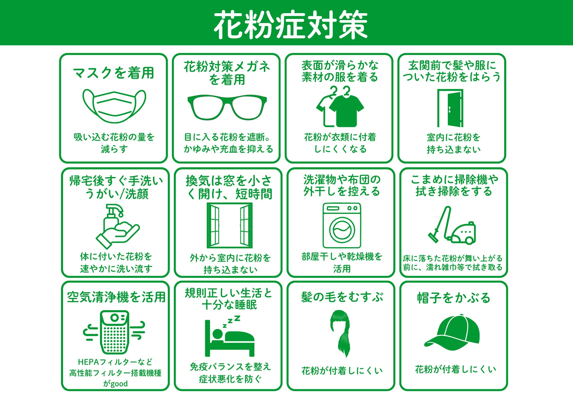 花粉対策は、ひとつの対策だけでなく複数を組み合わせることが重要です。以下のような対策を併用することで、より高い効果が期待できます。
