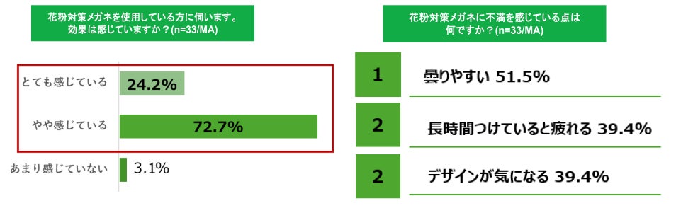 花粉対策メガネを使用している人の96.9%が「効果を感じている」と回答。一方不満点としては「曇りやすい」「長時間つけると疲れる」「デザインが気になる」などが挙げられており、自分に合った商品選びや正しい使い方が重要であることも明らかになりました。