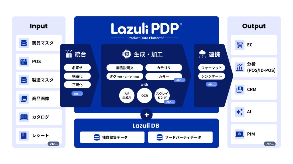 Lazuliが開発、提供する「Lazuli PDP」は、複数の外部データベースに点在していた商品情報を一括して管理し、データを活用しやすい形に整備、連携するためのクラウドサービスです。Lazuli独自の商品情報DBに格納されているデータをもとに、メタタグやカテゴリ、商品説明文などのプロダクトデータを生成し、製造業者や小売業者などが保有する多様な商品マスタデータをデータ活用に活かせる形式に変換・加工をを行います。これらによって、企業は顧客目線で必要な商品情報の発信やより詳細な顧客分析を実現することができます。