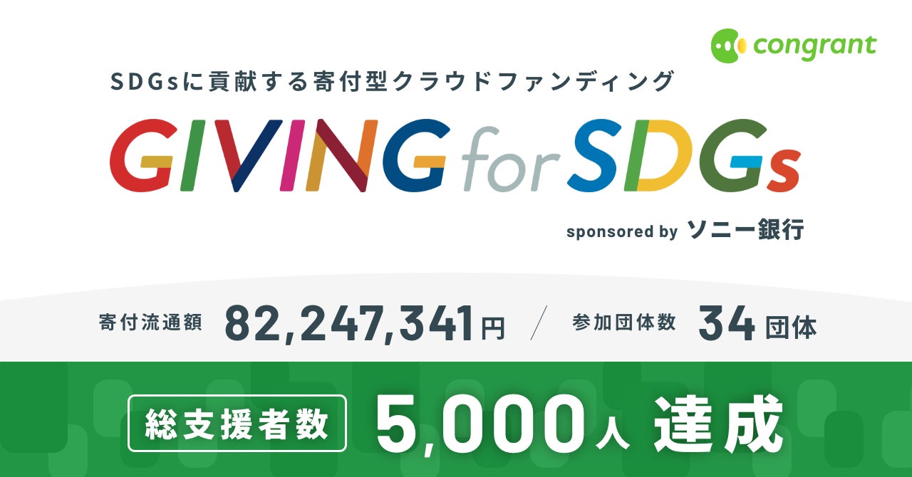 ソーシャルセクターと企業向けに「寄付DXシステム」を提供するコングラント株式会社(本社:大阪市西区、代表取締役:佐藤正隆、以下「コングラント」)は、ソニー銀行株式会社(代表取締役社長:南 啓二/本社:東京都千代田区)の協賛で運営するSDGsを推進するNPOのクラウドファンディングを支援するプログラム「GIVING for SDGs」にて、総支援者数5,000人を突破したことをお知らせします。