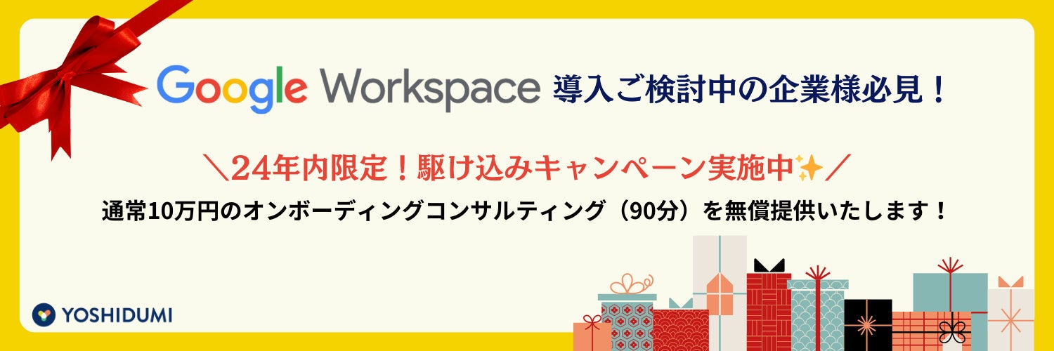 年内にGoogle Workspace を新規でご契約いただいた企業様限定で、通常10万円のオンボーディングコンサルティング(90分)を無料でご提供いたします!