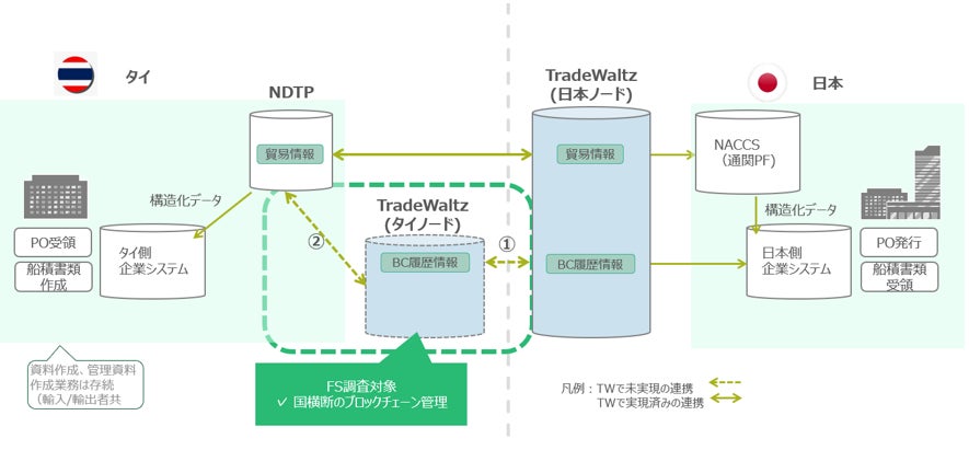 タイに関しては、昨年度のAPEC実証を通じ、現地に貿易PFが存在しTradeWaltzと繋がっている場合、日タイの貿易効率が60%以上効率化されることが示唆されました。その後、タイの某銀行との会合では、TradeWaltzの履歴記録用ノードをタイ側でも共同保有し、日タイ両国でデータ改ざんリスクを最小化しつつ、TradeWaltzをASEANへ展開するといったプランも話し合われました。そのため、今後日タイでのブロックチェーンの共同保有が技術的・経済的に有効か調査を行います。