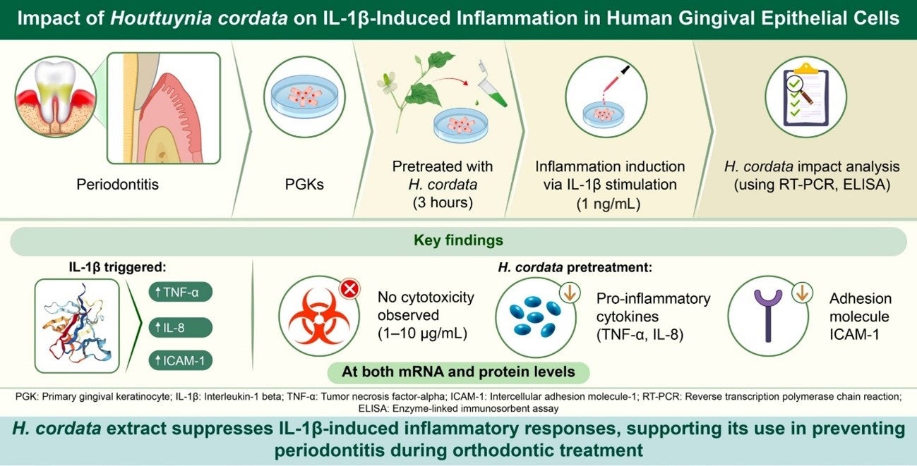 本研究により、ドクダミエキスが歯肉上皮細胞におけるIL-1β誘発性炎症に対して抑制作用を示すことが明らかとなりました。IL-1βは、矯正歯科治療の初期段階で歯周組織において顕著に産生が増加し、歯周炎の程度と相関することが知られています。したがって、ドクダミエキスは矯正歯科治療中に起こりうる歯周炎の予防に有用である可能性が示唆されました。