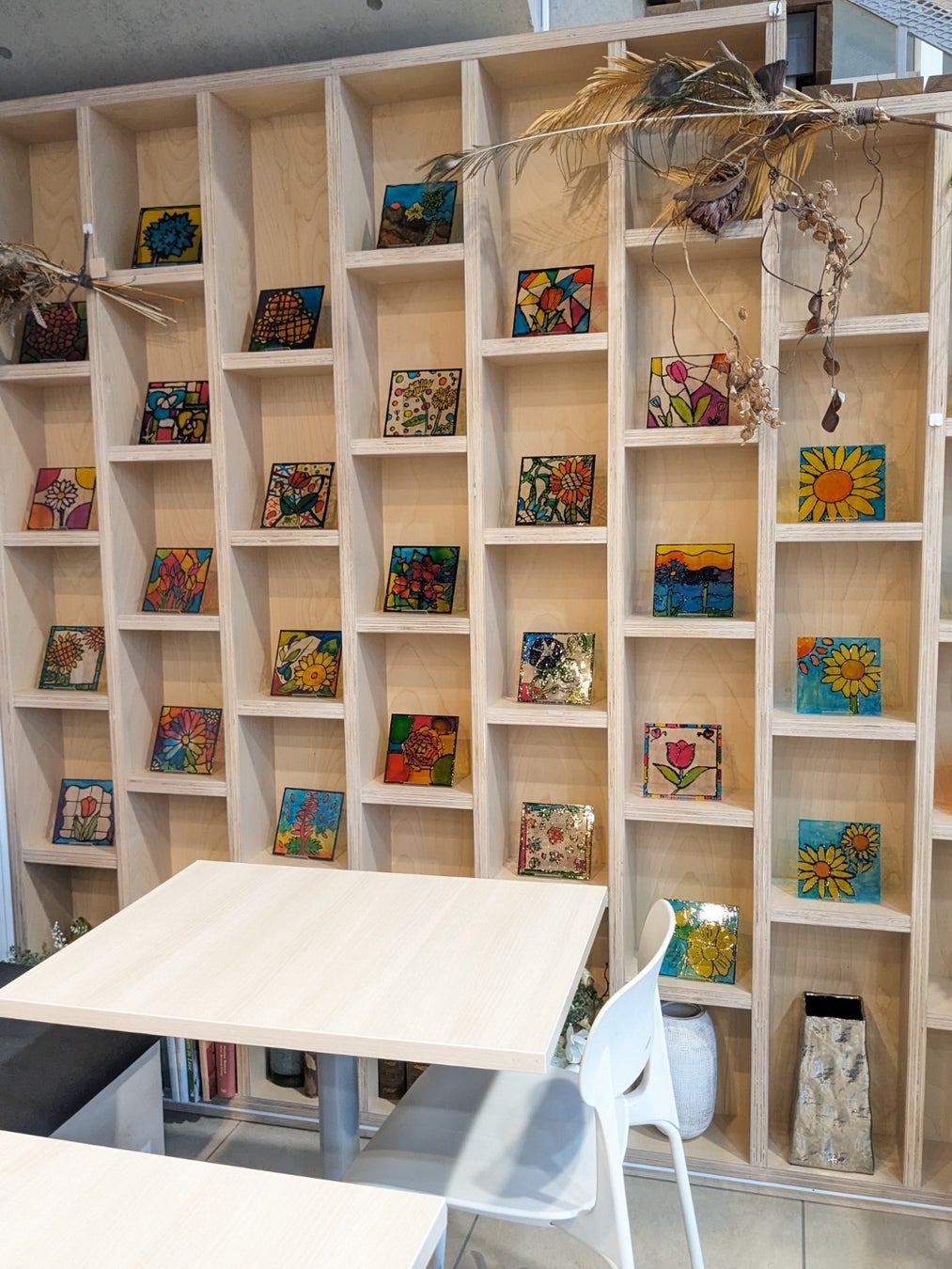 上沖小学校は、感性や創造性を育むことを目的とした「アート」学習を取り入れています。「花いっぱいの学校」として年間約20種類以上の花が咲き誇る上沖小学校ならではの、花を題材にしたステンドグラスがモチーフの卒業作品を制作。児童同士で作品を鑑賞するだけでなく、同じ学校の児童、保護者、地域の人にも鑑賞してもらうことによって、自分たちが生み出した「アート」が多くの人の心を動かすことを実感し、生涯にわたって「アート」と共に過ごす児童を育成していきたいとの思いから、学校以外の場所での展示を決めました。地域の方々が集う場であり、“BLOOMY(開花・満開)“という店名と作品のコンセプトが一致したことから、展示場所の候補として当カフェにお声がけをいただきました。当カフェも、まちににぎわいを創出することを目的に運営を行っており、地域の子供たちの育成と、地域の方々が「アート」に触れる機会の創出に、少しでも力になれればとの思いからご協力させていただくことにいたしました。