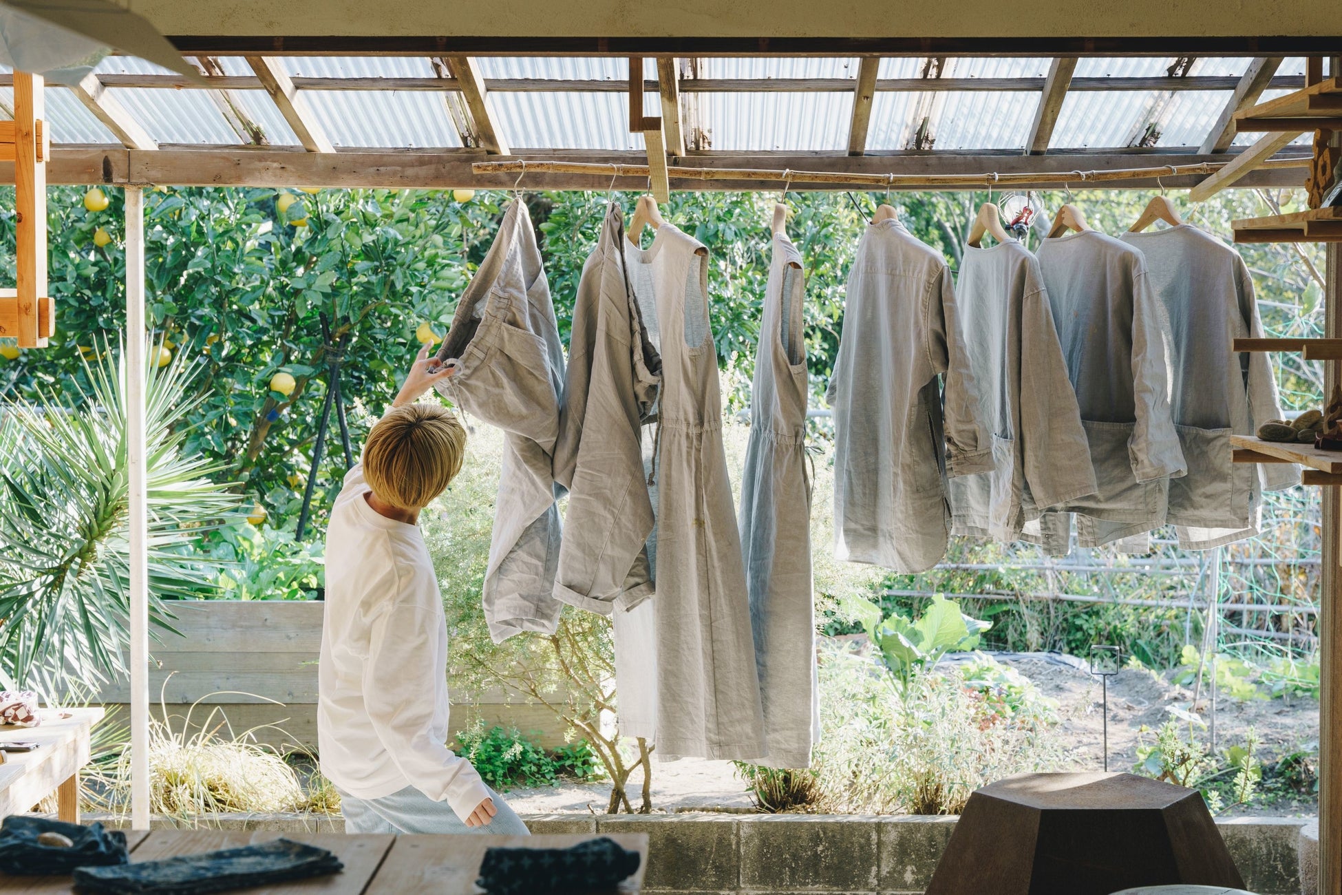 裁断くずから作られたアップサイクルリノの柔らかな生地、火山灰から染め上げたやさしい色合いが魅力。自然体の自分に馴染むシンプルで洗練されたスペシャルなアイテムが展開。
