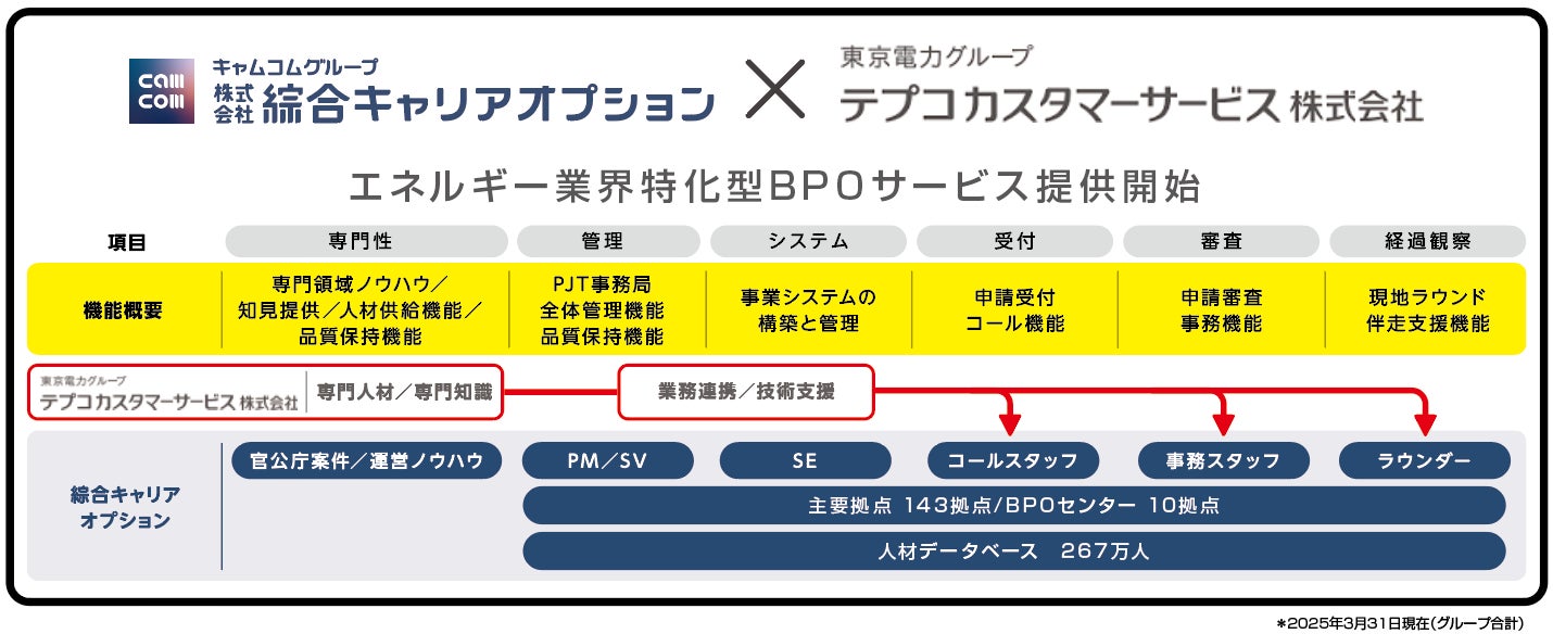 「働く」に関する社会課題をビジネスで解決するキャムコムグループで人材派遣、人材紹介、BPO事業を担う株式会社綜合キャリアオプション(以下綜合キャリアオプション、本社:東京都新宿区、代表取締役:神保紀秀・大泉高太)は、2026年2月より、東京電力グループのテプコカスタマーサービス株式会社(以下テプコカスタマーサービス、本社:東京都港区、代表取締役社長:福田敦)と連携し、新たにBPOサービス「エネルギー業界特化型BPOサービス」の提供を開始しました。