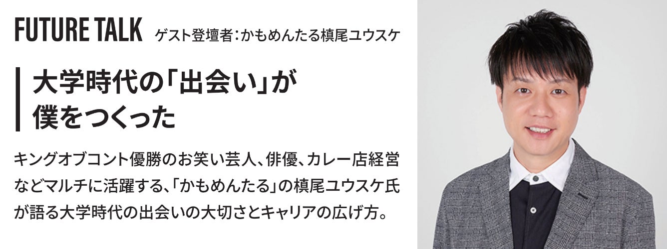 お笑い芸人、俳優、カレー店の店主と幅広く活躍する「かもめんたる」の槙尾ユウスケ氏を招き、お笑い芸人を目指す原点となった大学時代の出会いやキングオブコント優勝へと至る道のり、そこから更に広がったマルチなキャリアの裏側を赤裸々に語っていただきます。