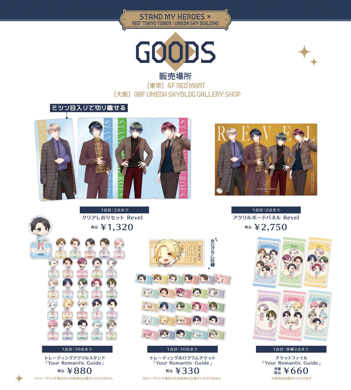今回のコラボでは、イベント会場を東京と大阪2拠点に拡大し、新規描き下ろしイラストを使用したグッズ販売や、Revel4人の撮り下ろしボイスを含む謎解き、コラボカフェなど『スタンドマイヒーローズ』の世界を楽しめる盛りだくさんのイベントとなっております。