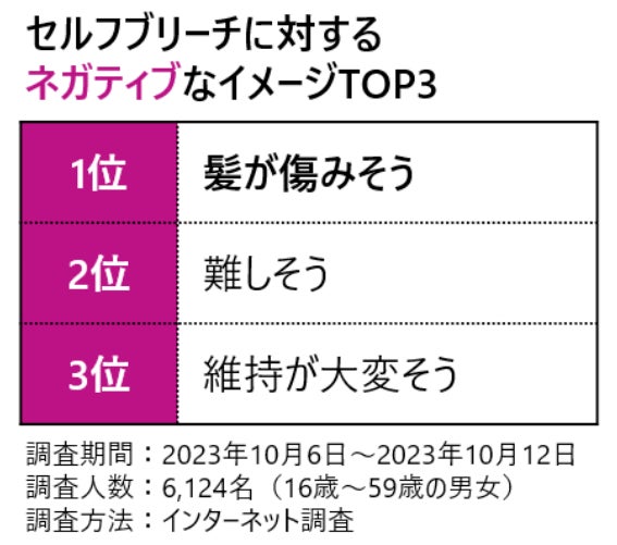 昨今働く人の多様性を尊重する風潮の高まりから、「身だしなみ基準の緩和」や「身だしなみ自由化」をうたう企業が増え、自由な髪色を楽しむ人が増えています。一方で16歳~59歳の男女6,124名を対象に「セルフブリーチに対するネガティブイメージ」を調査したところ、「髪が傷みそう」という回答がもっとも高く、続いて「難しそう」というイメージがあることがわかりました。