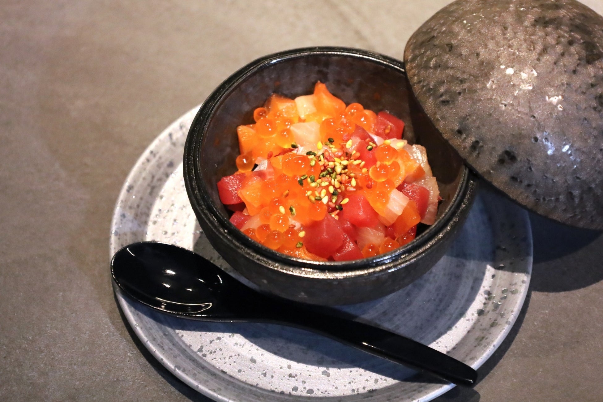 秘伝醤油に漬けこんだ中トロと赤身、雲丹、卵黄を巻物に。別に供される濃厚赤出汁ソースとともに口に含めば、全てが渾然一体となり、濃厚な旨味が溢れ出します。