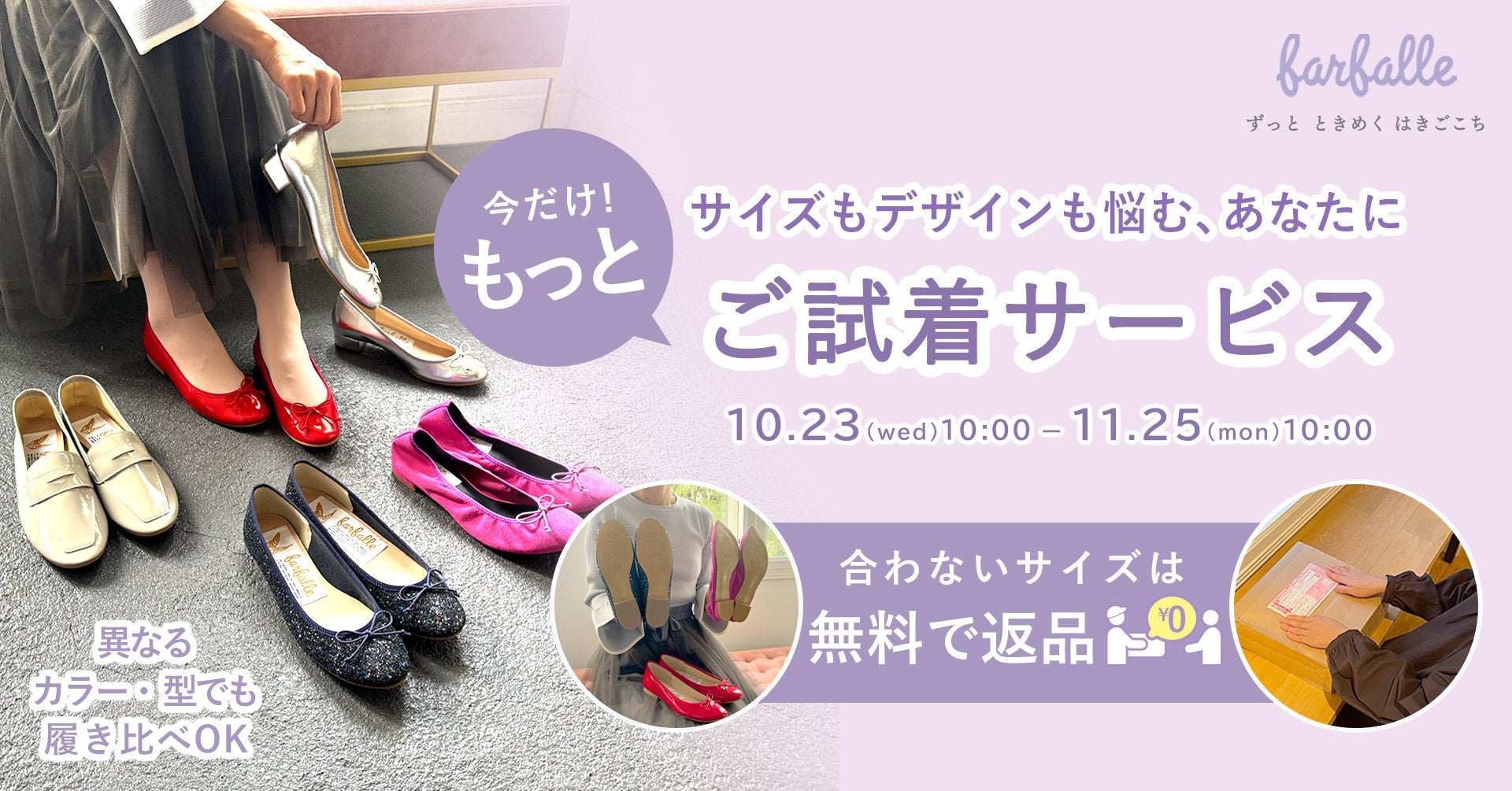 「ここち良さを、あたらしい視点から」を企業理念に掲げるレディースアパレルの株式会社クロシェ(代表取締役:沼部 健、本社:神戸市中央区=以下、クロシェ)は、自社のバレエシューズブランド【farfalle/ファルファーレ】のオンラインショップで提供しているサイズ悩みにお応えする「ご試着サービス」を、約1か月の期間限定で靴の型(デザイン)や色にも対応する「もっとご試着サービス」を実施いたします。