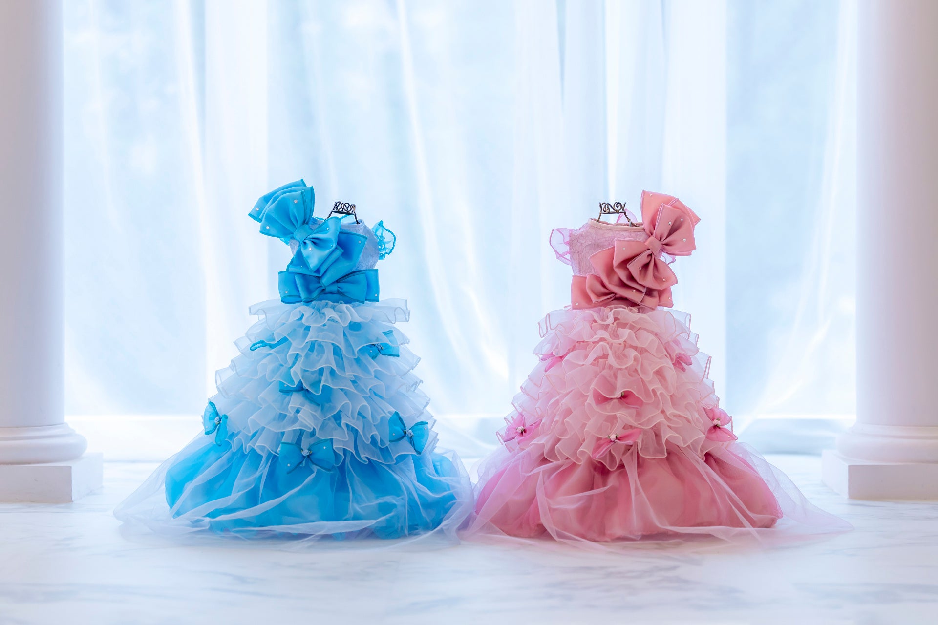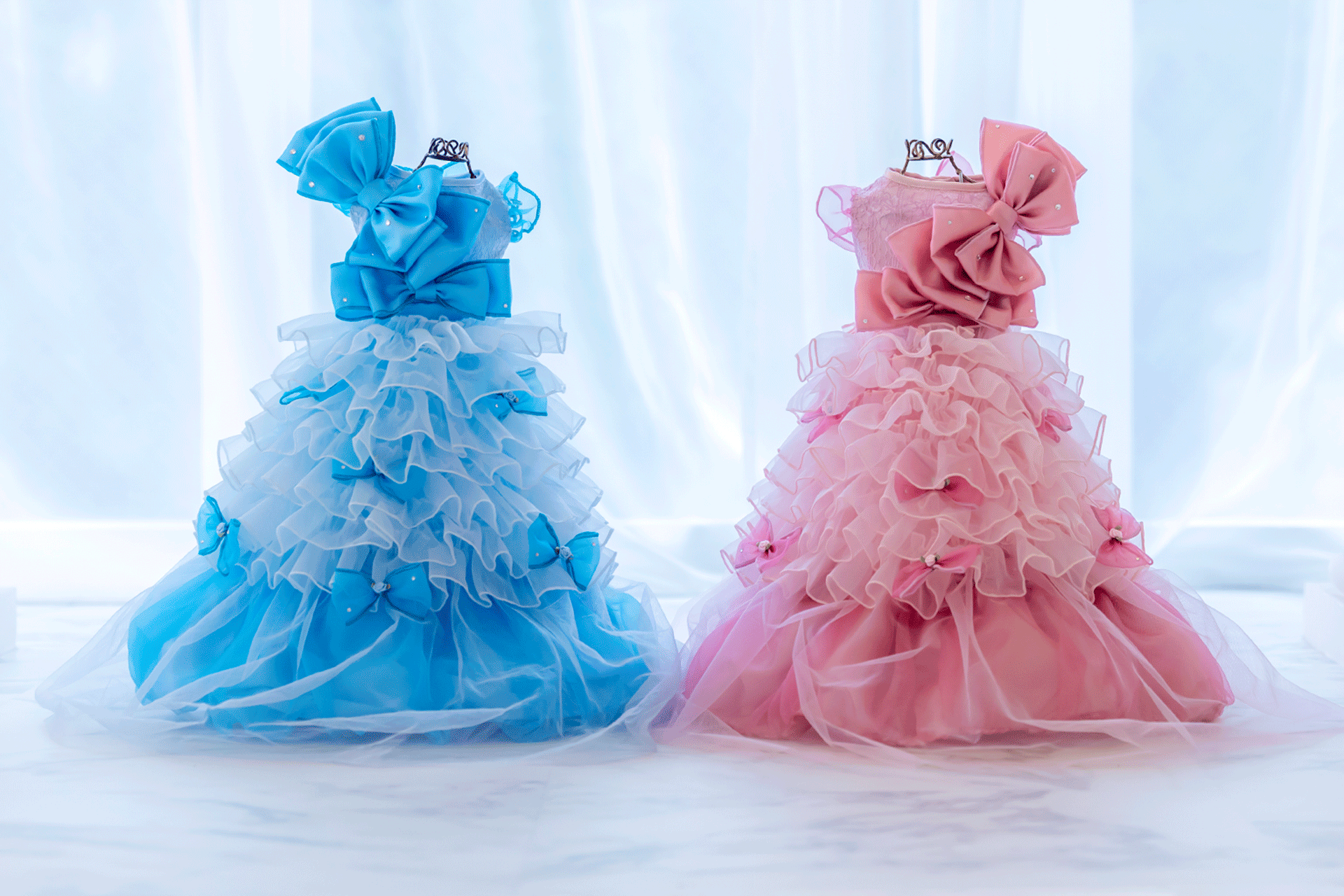 「ミラクルジェミニ」は、シンメトリーにデザインされたまるで双子のようなブルーとピンクのドレスです。フリルを取り外すことで印象が変わる、2WAY構造を採用しています。
