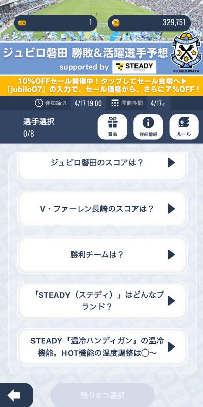 予想成績上位者には温冷ハンディガンなどSTEADYのボディケア商品や選手直筆サイン入り色紙をプレゼント!