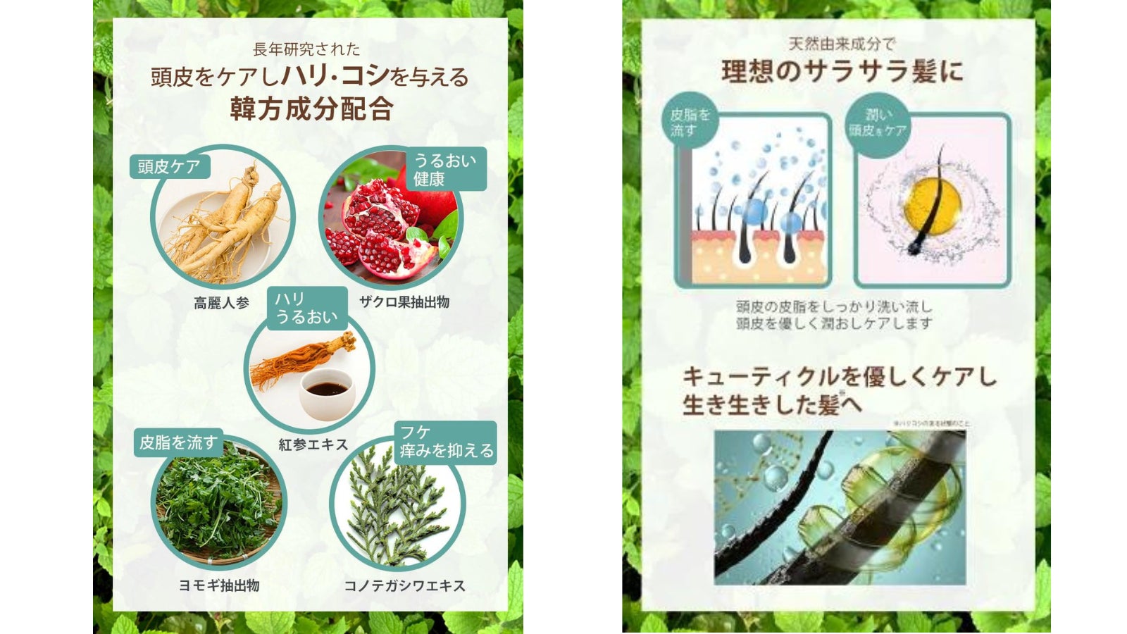 最大の特徴)長年研究された頭皮をケアし、ハリ・コシを与える韓方成分配合