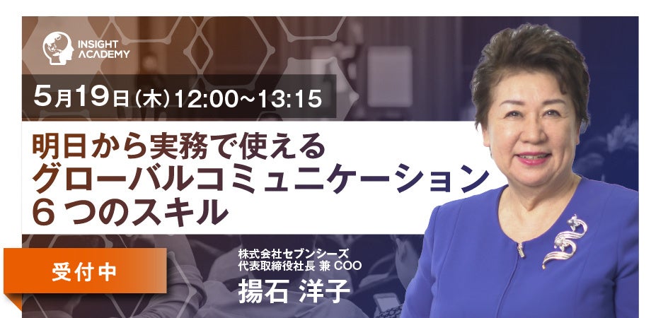 嘉章)は、大好評セミナーのアーカイブ動画、明日から実務で使える「グローバルコミュニケーション6つのスキル」を、2022年5月19日(木)12時より生配信致します。
