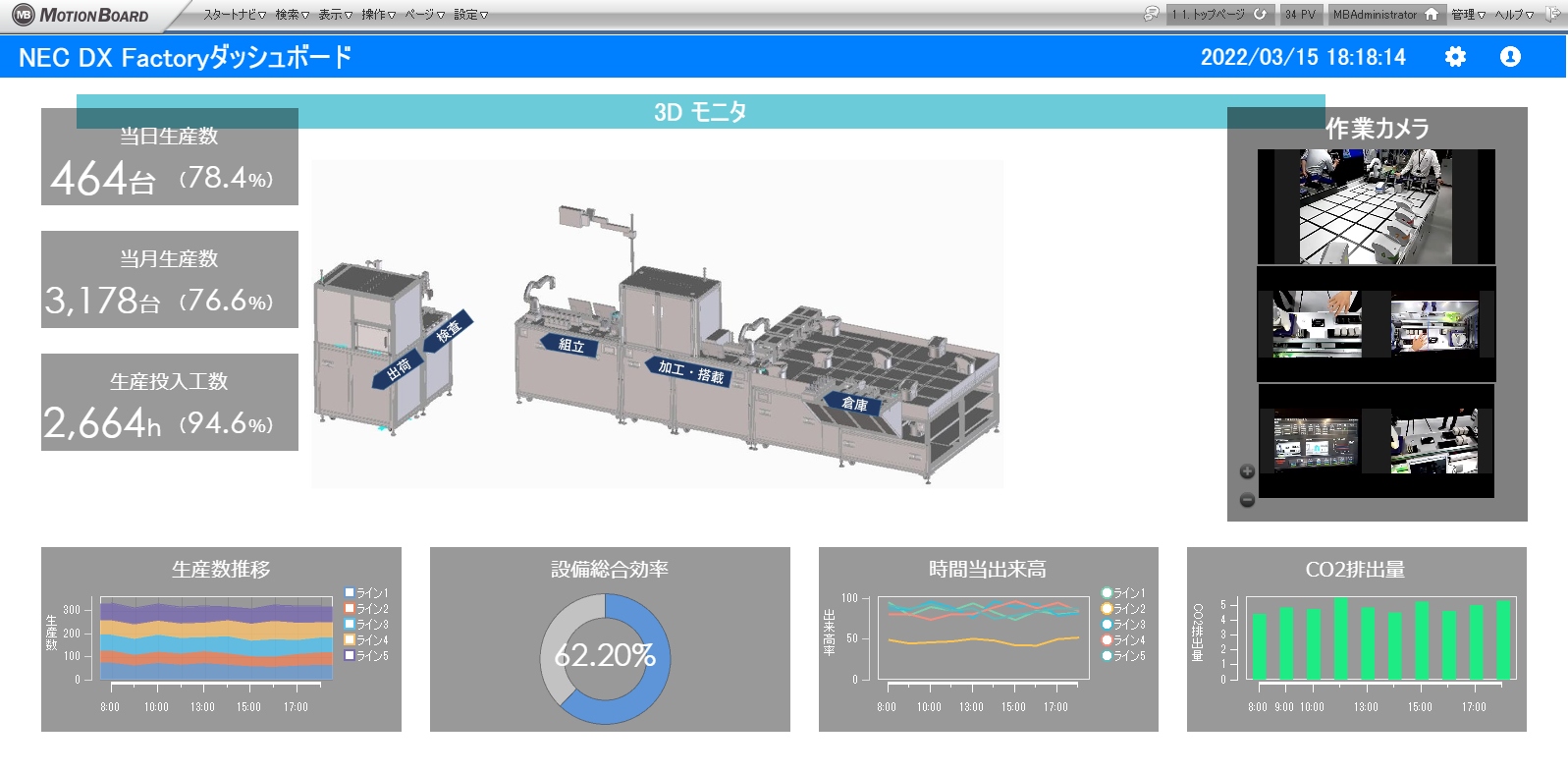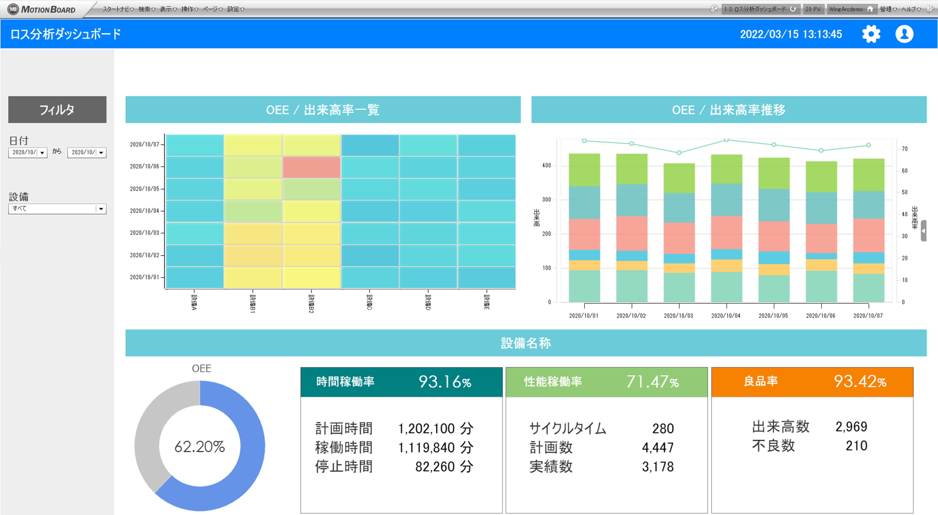 本サービスに、国産BIダッシュボードトップシェアとして多くの製造業のお客様に導入している「MotionBoard」が連携することで、製造業に特化したデータの表現が可能となり、ものづくり現場におけるより高度な各設備・人のデータを見える化・分析を行い、素早く改善効果を出すことができます。(MotionBoardは、今後の強化としてカメラ動画との連携も予定しています。)