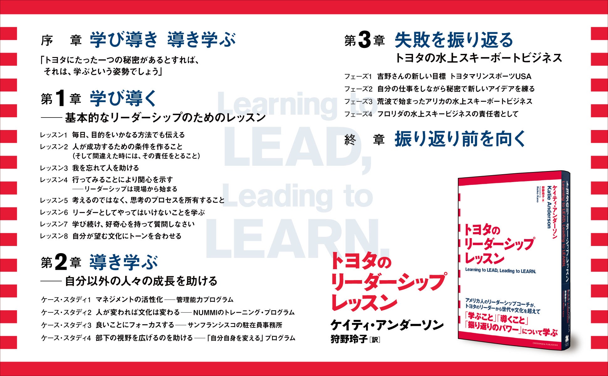 本書は国際的に活躍する米国人リーダーシップ・コーチ、ケイティ・アンダーソン氏がトヨタ勤続40年のリーダー・吉野さんに2年以上の長期にわたってヒアリングとレビューを行い、書き下ろしたものです。