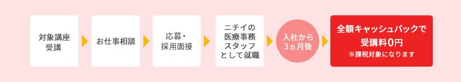 当社が運営する「医療事務講座」「メディカルドクターズクラーク講座」などの対象講座・コースを、受講中または修了後1年以内に、ニチイの医療スタッフとして就職し3カ月継続して就業した場合に、お支払いいただいた受講料相当(※1)をお戻しする制度です。