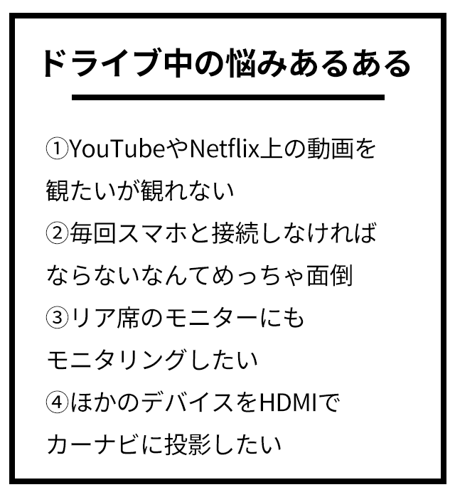 しかし、他のデバイスの画面をカーナビに同期させたいと思ったことはありませんか?