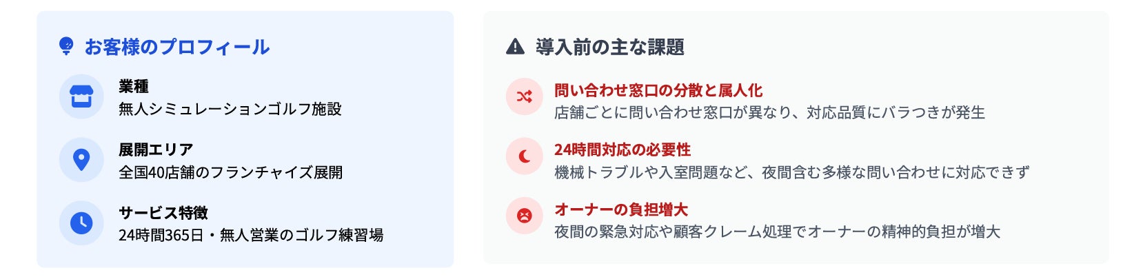 特に、無人運営の特性上、機器トラブルや入室エラー、会員同士のトラブル、災害時の緊急連絡など、多様な問い合わせに24時間体制で応答できる電話窓口の整備が急務となっていました。